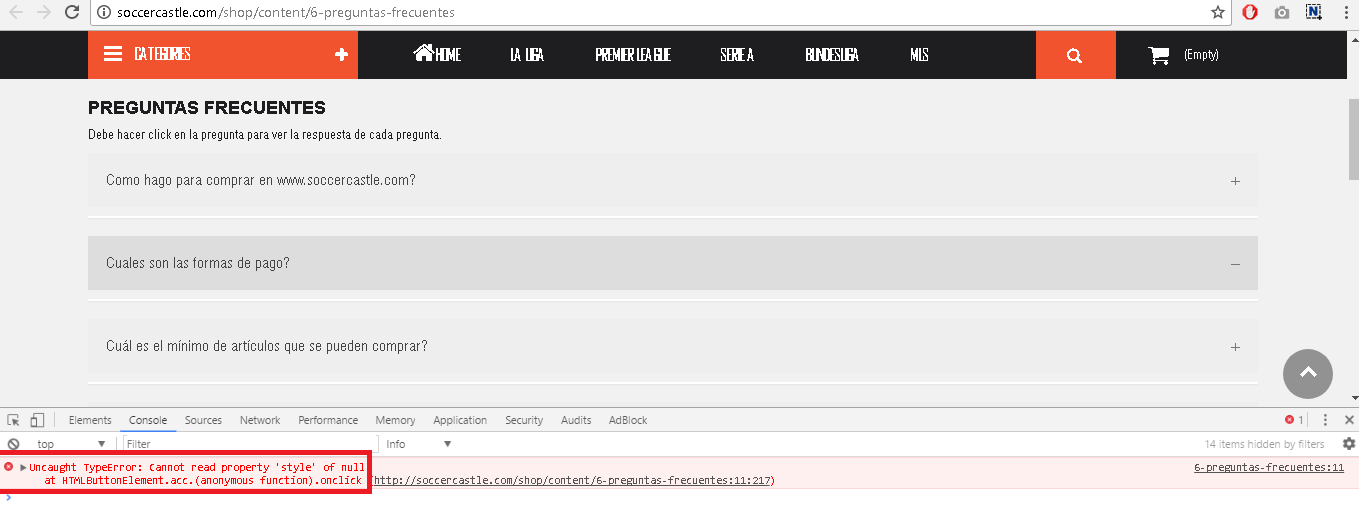 ThomasMery Posted June 3, 2017 Author Share Posted June 3, 2017 Entonces al solucion es eliminar esa linea? Actualizo mi mensaje, acabo de entrar a tu tienda y veo que ya tienes el codigo javascript insertado, pero te pega petardazo por lo que veo, al hacer click. Desde la "console" en Chrome, puedes ver el error. Pego imagen errorjavascript.png Asi que parece un fallor el codigo javascript, a que ver como adaptarlo para que funcione en tu situacion. Yo creo que el fallo origen empieza a partir de esta linea: var panel = this.nextElementSibling; Link to comment Share on other sites More sharing options...