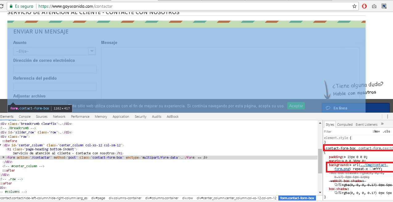 Sergio Ruiz Posted May 31, 2017 Share Posted May 31, 2017 Hola Sergio, el otro día lo que me fallaba era la página de recuperación de contraseña. Y hoy era el mismo problema pero en la página de contacto (yo no sabía que era el mismo). Intenté quitar la imagen que había en la parte superior (rayas azules y rojas tipo carta urgente del tema default) pero oculté todo el contenido sin darme cuenta porque el navegador no debió actualizar Lo dicho. Muchas gracias por vuestra ayuda Esa "imagen" es un fondo. Muestro imagen El fondo esta en: /themes/default-bootstrap/img/contact-form.png Y en el fichero: /themes/default-bootstrap/css/contact-form.css Aquí: .contact-form-box { padding: 23px 0 0 0; margin: 0 0 30px 0; background: url(../img/contact-form.png) repeat-x #fff; -moz-box-shadow: rgba(0, 0, 0, 0.17) 0px 5px 13px; -webkit-box-shadow: rgba(0, 0, 0, 0.17) 0px 5px 13px; box-shadow: rgba(0, 0, 0, 0.17) 0px 5px 13px; } En esta "parte" -> background: url(../img/contact-form.png) repeat-x #fff; Tienes la llamada al fondo. De todos modos para no alargar el tema que ha quedado solucionado, mejor para esa duda si no la solucionas, crea un tema nuevo. Un saludo, Para el tema actual, creo que tienes que añadir la palabra "Solucionado": https://www.prestashop.com/forums/topic/269515-solucionado-%C2%BFcomo-poner-la-palabra-solucionado-en-el-titulo-del-tema/ al titulo del tema. Link to comment Share on other sites More sharing options...