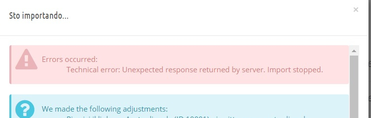 devahabib Posted May 31, 2017 Share Posted May 31, 2017 (edited) Sono un neofita di prestashop che ho installato su Aruba Prestashop 1.7.1. Quando tento di importare prodotti.csv, l'import si blocca al 5% e mi appare la seguente finestra di errore: Errors occurred: Technical error: Unexpected response returned by server. Import stopped Non riesco a venirne a capo ormai da alcuni giorni nonostante abbia fatto tante prove, qualcuno sa come risolvere? Attendo dritte! Grazie Edited June 1, 2017 by devahabib (see edit history) Link to comment Share on other sites More sharing options...