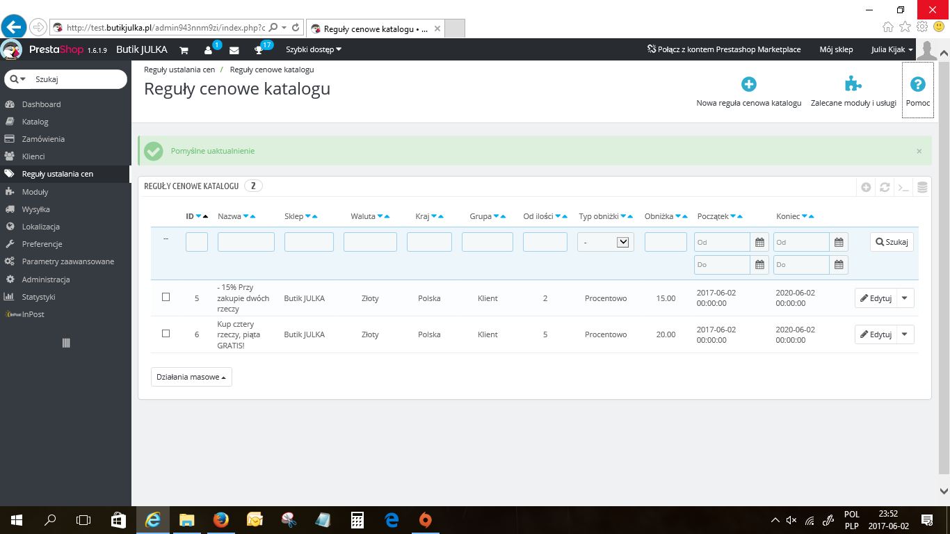 ravienne Posted June 2, 2017 Share Posted June 2, 2017 Witam, chcę osiągnąć taki efekt jak w temacie. Może być także rabat kwotowy (przykładowo przy 60zł wydanych 10zł mniej). Mam prestę 1.6. Załączam screeny tak jak mam ustawione. powinno od kwoty 95zł wejsc 15% rabatu. Link to comment Share on other sites More sharing options...