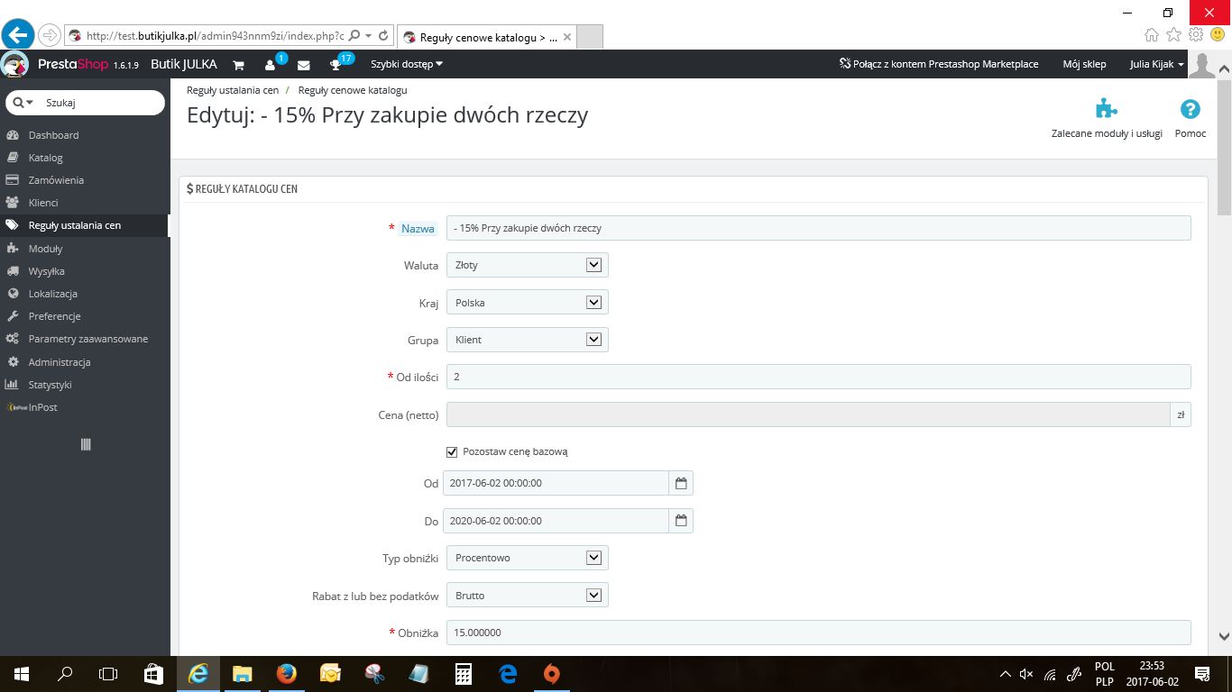 Witam, chcę osiągnąć taki efekt jak w temacie. Może być także rabat kwotowy (przykładowo przy 60zł wydanych 10zł mniej). Mam prestę 1.6. Załączam screeny tak jak mam ustawione. powinno od kwoty 95zł wejsc 15% rabatu.