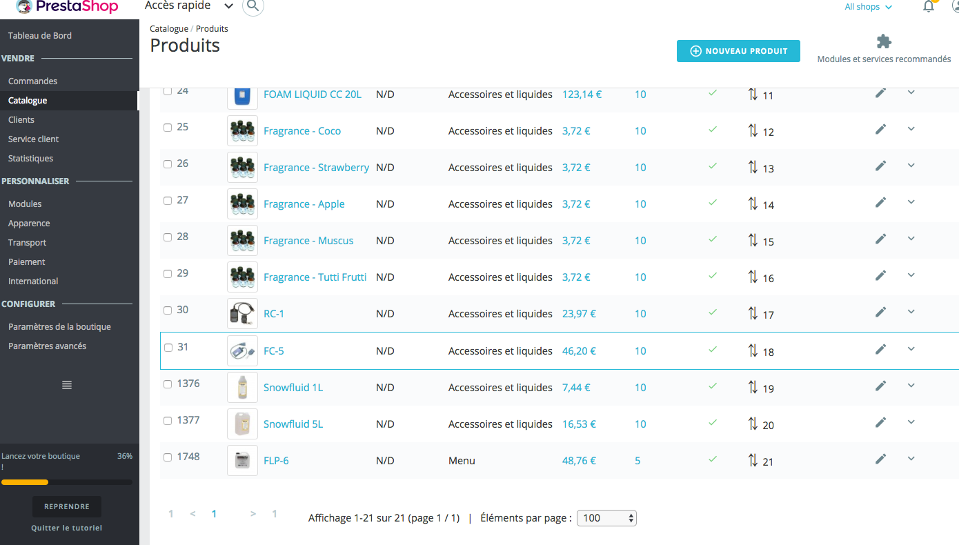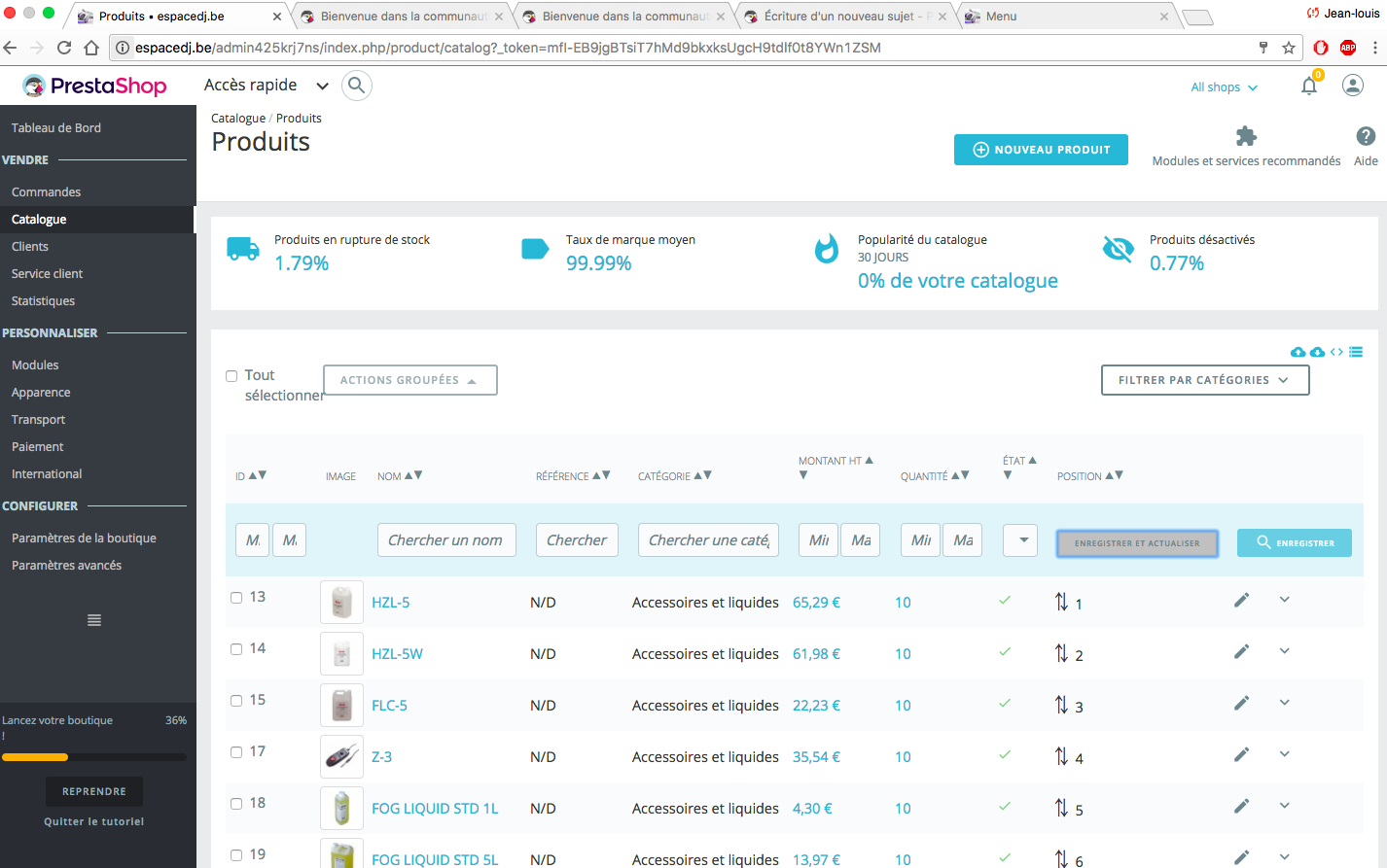 macjl2 Posted June 4, 2017 Share Posted June 4, 2017 Bonjour, J'utilise Prestashop sous sa version 1.7.0.2 Depuis un certain temps, lorsque je veux gérer mes produits dans mon back-office, (suivant le chemin : vendre --> catalogue --> produits) je n'ai plus accès qu'à 21 produits, alors que mon catalogue en comporte 1282 articles. Je peux encoder des nouveaux produits mais pas gérer les produits déjà encodés. Avez-vous une idée de l'origine du problème ? Merci. Link to comment Share on other sites More sharing options...