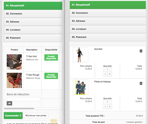 Agnès_Ts Posted June 6, 2017 Share Posted June 6, 2017 (edited) Bonjour, J'ai trouvé trace de réponse mais pour des versions plus anciennes... ou le topic trouvé qui se rapproche le plus ne donne pas la solution. Je ne trouve pas les fichiers à modifier / corriger même en tentant de comparer avec la boutique d'origine, livrée avec Prestashop qui ne contient pas ce dysfonctionnement En prestashop 1.6.1.6, thème par défaut quelque peu modifié Dans la page de commande, en version mobile : - Un "dernier produit ajouté" apparait on ne sait pourquoi - Le tableau de la commande apparait avec un scroll horizontal, les totaux ne sont pas visibles et ce n'est pas extra Pouvez vous m'aider à résoudre ces 2 choses ? Merci grandement Agnès Edited June 7, 2017 by Agnès_Ts (see edit history) Link to comment Share on other sites More sharing options...