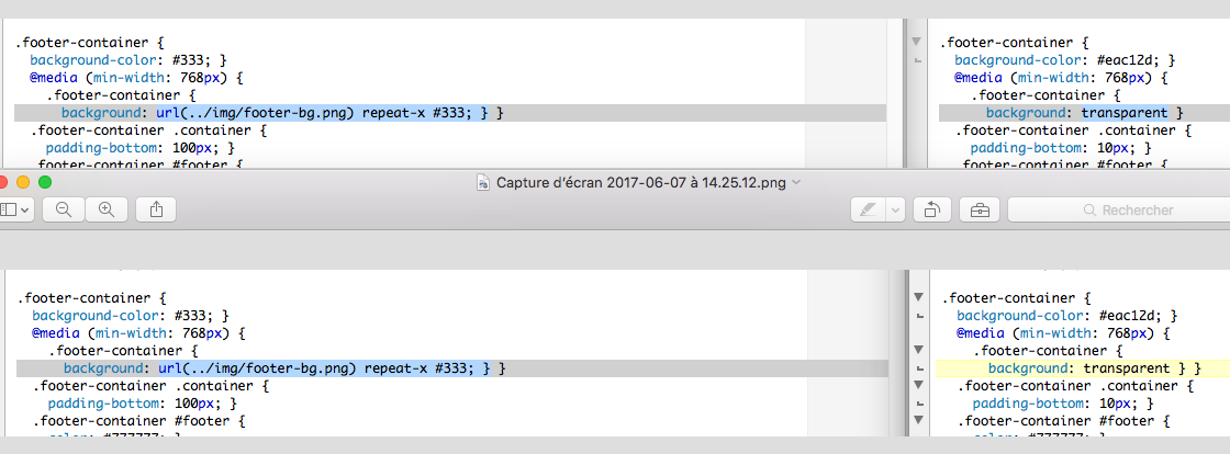 Agnès_Ts Posted June 7, 2017 Author Share Posted June 7, 2017 (edited) Suis sous Mac et j'utilise TextWrangler Bonjour et merci pour votre intérêt ! Mon site : www.tisac.shop, mais j'ai vu ce bug sur d'autre site, pioché dans le sous forum "tester mon site" : celui ci par exemple ou d'autres que je ne retrouve plus, j'ai bien l'impression que cela touche pas mal de sites en version mobile. En triturant le fichier shopping-cart.tpl, le "dernier produit ajouté" est parti, alors qu'en comparant ce fichier avec celui de la boutique originale, ils étaient identiques, la boutique originale n'affiche pourtant pas de "dernier produit ajouté" et le responsive est ok. C'est peut être un bug du aux option CCC : Un topic ici mais qui ne donne que partiellement la solution Dans la parti CCC du back office, tout est à OUI, sauf ""Smart cache" pour les feuilles de style" est ce que je peux tout passer à NON pour voir le résultat, sans avoir d'incidence sur la boutique ? Merci ! Agnès Edited June 7, 2017 by Agnès_Ts (see edit history) Link to comment Share on other sites More sharing options...