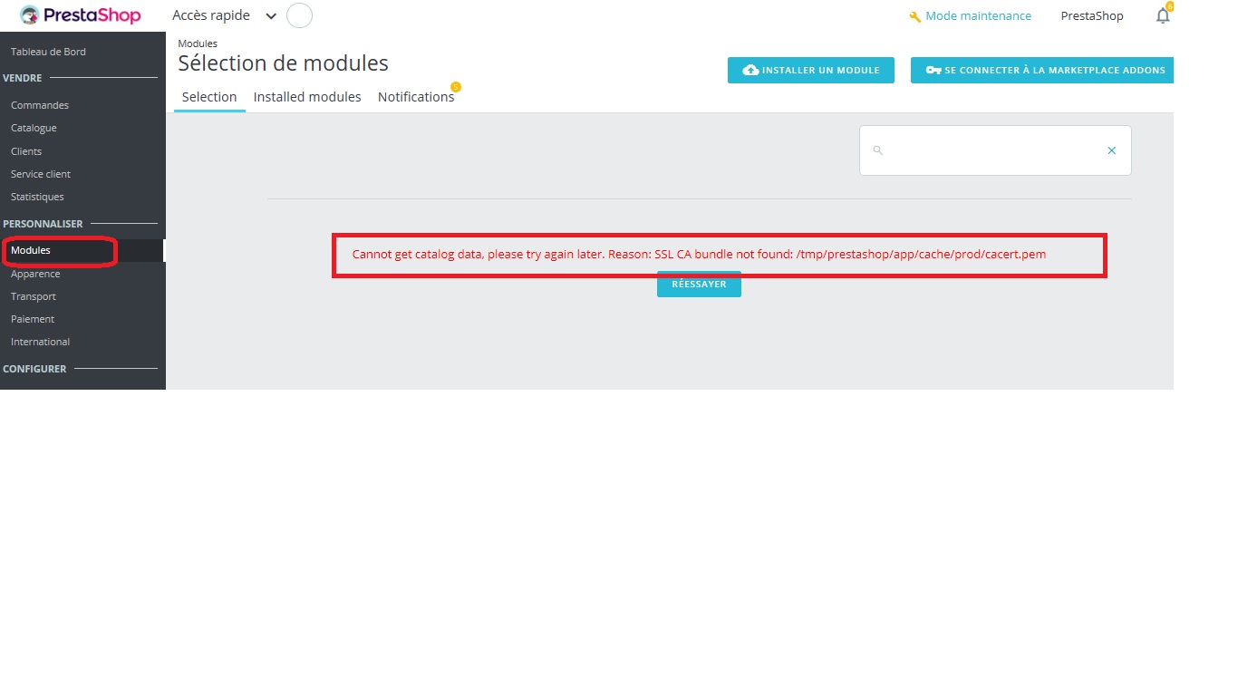 Lorsque je clique sur Modules (dans Personnaliser), voici le message qui apparait: