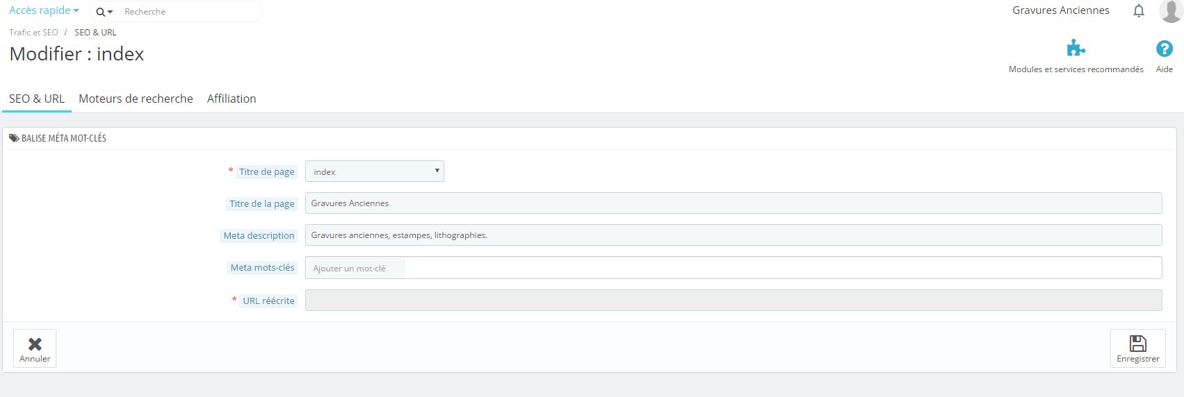 Jeremy Maillefer Posted June 8, 2017 Share Posted June 8, 2017 Bonjour à tous ! Je suis sur Presta 1.7.1.1 Thème : Classic URL : www.gravuresanciennes.com Hebergement : OVH Je suis un peu novice et ... là j'avoue que j'ai épuisé toutes mes cartes. J'aimerai changer le titre du site, qui est "Prestashop" comme il est montré sur l'image, ainsi que "Boutiques propulsé par Prestashop" ... J'ai fouiller de font en comble les options qui se sont mis sur mon chemin. J'ai été dans le backoffice, Parametre de la boutique, contact, j'ai changé le nom du magasin, ça à rien fait. J'ai été dans SEO & URLS, j'ai édité la page Index, j'ai chercher pas mal dans mon FTP ... je trouve pas, quelqu'un peu me donner un coup de mains s'il vous plait ? Merci d'avance. Link to comment Share on other sites More sharing options...