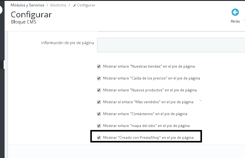 Sergio Ruiz Posted June 10, 2017 Share Posted June 10, 2017 Hola estoy empezando a modificar ciertas cosas de la plantilla que maneja PS y me e topado con este detalle anteriormente si me dejo hacer cambios pero despues de un rato todo volvio a como estaba por defecto ya revise el archivo "Blockcms.tpl" y todos los cambios siguen igual como yo los e editado. No se si se genera otro archivo por aparte y que yo lo este ignorando añado parte del codigo {l s='[1] %3$s %2$s - Some Rights Reserved %1$s [/1]' mod='blockcms' sprintf=['Heart Craft México' esos cambios estan en public_html/themes/default-bootstrap/modules/blockcms. pero en la pagina sigue estando como si ningun cambio. espero me puedan ayudar Hola, En Prestashop 1.6: los textos los cambias en la pestaña Localización -> Traducciones. Y por otro lado la configuración del módulo bloque cms en la pestaña modulos -> modulos, tienes una casilla que dice quitar copyright Pego imagen para que lo veas De todos modos, si te da por editar el tpl que has dicho, ¿has limpiado cache en la pestaña parametros avanzados - rendimiento? En cambio si usas prestashop 1.7, el proceso es un poco diferente, como puedes ver en esta guía del usuario Nadie: http://victor-rodenas.com/2016/12/13/cambiar-copyright-del-pie-de-pagina-en-prestashop-1-7/ Link to comment Share on other sites More sharing options...