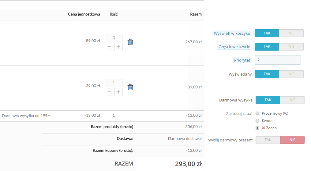 Mam problem bo zrobiłem kod rabatowy na darmowa wysyłkę od jakieś kwoty, wszystko działa idealnie tak jak chciałem, ALE w koszyku pokazuje głupoty... bo jak kod się aktywuje koszt produktów to np 200zł potem pokazuje poniżej "Darmowa wysyłka" i tutaj by było ok ale potem poniżej "Razem Kupony" -13zł (moje koszta wysyłki) i potem na podsumowaniu pisze "Do zapłaty" : 187zł ... a to nie prawda po powinno być 200zł ... czyli on robi darmowa wysyłkę oraz odejmuje koszta wysyłki... ALE to dzieje się tylko w koszyku, bo już potem wszystko jest dobrze i na przelewie itp pisze 200zł tak samo w administratorze mi pisze 200zł