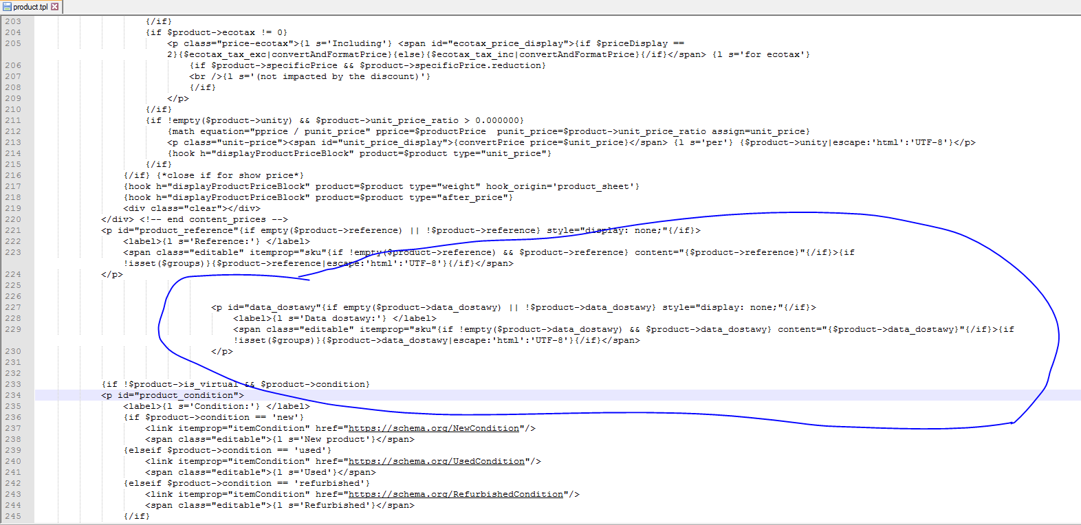 Problem w tym że w back office to pole jest dostępne, widoczne można je edytować i w nie wpisywać, do bazy danych się dodaję lecz nie pokazuje się na stronie produktu, tak jakby nie pobierało się z bazy danych.