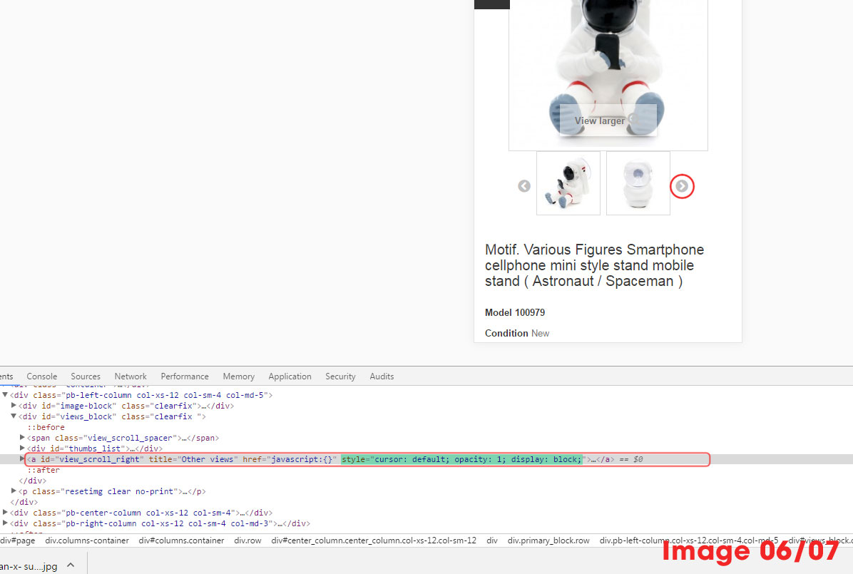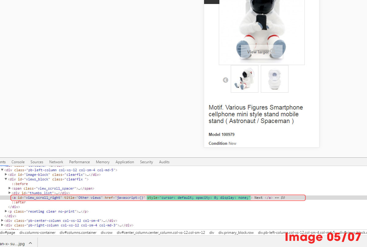 kawamono Posted June 18, 2017 Share Posted June 18, 2017 My website is http://kawamono.comI'm using prestashop 1.6.11, using default theme, image 01 show the product image slider have 4 image ( totally i have 5 image ), the 5th image will appear when i click the ">" button ( green circle ).IMAGE01 ( The red frame )image 02 show the 5th image, this is normal and good, the problem start from responsive theme.IMAGE02 ( The red frame )At image 03 show the responsive theme, normally, because of the resolution, the image slider only show two boxes thumbnails plus a ">" button, that's good and acceptable.IMAGE03 ( The red frame )When i click the ">" button, then it turns to 3rd and 4th image like image 04.IMAGE 04 ( The red frame )Now, the problem is appear, the 5th image will not be show because the ">" button is gone...( Green circle ),i open chrome brower DevTools ( F12 ) and check the missing ">" button show by image 05.IMAGE 05 ( The red frame )There will see the html code marked by green area :style="cursor: default; opacity: 0; display: none;"I figure out this maybe the problem from javascript, but i don't know how to fix this, and i try to modify the code in the DevTools like this :style="cursor: default; opacity: 1; display: block;"Then the ">" button appear again like image 06.IMAGE 06 ( The red circle )After that, i click the ">" button, and the 5th image is show like image 07IMAGE 07 ( The red frame )I just wonder how can i fix this, which file i need to modify? I really need for help, Thank you very much. Link to comment Share on other sites More sharing options...