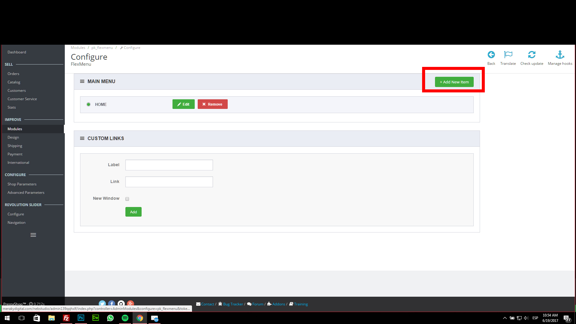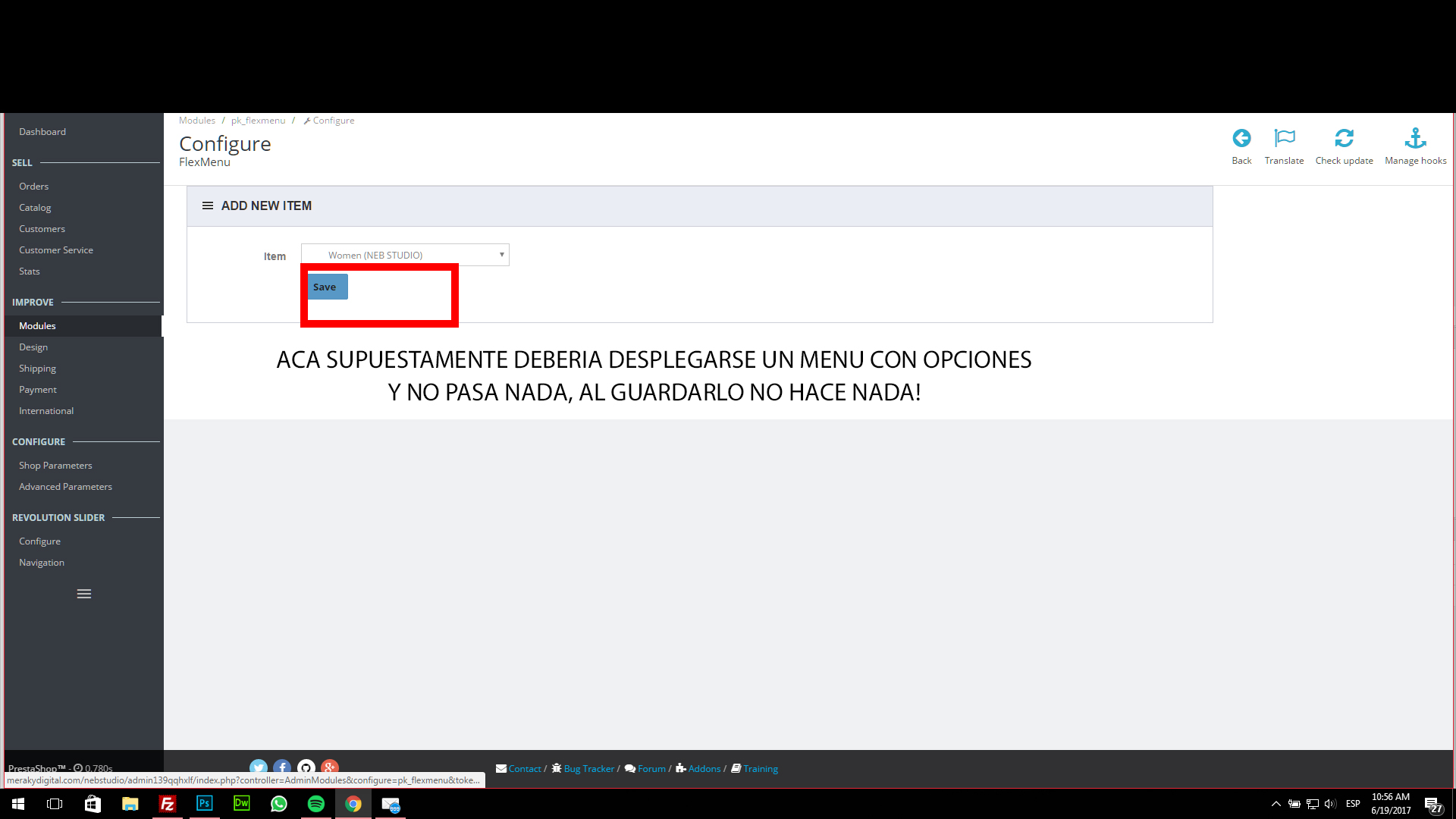 lucastayub Posted June 19, 2017 Share Posted June 19, 2017 Hola Comunidad! He comprado el templete Alysum - Premium Prestashop 1.7 & 1.6 ThemeY trae el modulo Flex Menu, y cuando intento crear un nuevo menu no hace nada! Les adjunto las fotos, tengo la ultima version de prestashop.! Si necesitan mas data o acceso avisenme! Link to comment Share on other sites More sharing options...