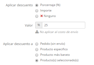 fcjurado Posted June 21, 2017 Share Posted June 21, 2017 (edited) Buenas tardes, ¿alguien sabe cómo se puede hacer que un vale de descuento por importe, sea aplicado sólo a productos(s) seleccionado(s)? Es curioso que encuentro mucha info sobre cómo hacerlo, pero sólo cuando el vale es de tipo porcentaje, no de tipo importe. Saludos, Edited June 21, 2017 by fcjurado (see edit history) Link to comment Share on other sites More sharing options...
