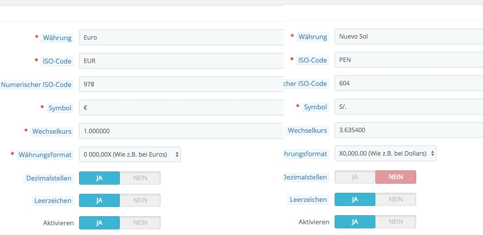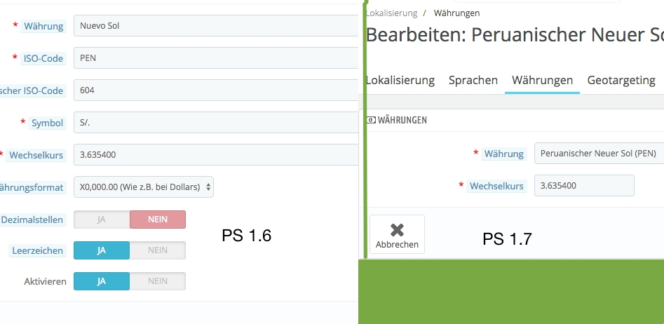 Jörg Saxtec Posted June 23, 2017 Share Posted June 23, 2017 (edited) Hallo, in PS 1.6 konnte man festlegen, wie ein Preis im Frontend dargestellt wird.Zur besseren Verständlichkeit: Ich meine die Preisauszeichnungen wie: 100,00 € - CHF 100,00 oder $ 100,00 . Wie und wo kann ich das in PrestaShop 1.7.1 umsetzen? Leider werden alle Währungssymbole NACH dem Preis angezeigt. Zur Verdeutlichung habe ich einige Screenshots beigelegt. Und nein, ich möchte nicht PS 1.6 einsetzen, da ich überzeugt bin, dass in PS 1.7.X trotz bekannter Anfangsschwierigkeiten sehr viel Potential steckt, und das Frontend auch in der Classic Version um Längen Kundenfreundlicher ist. Liebe Grüße, Jörg Edited June 23, 2017 by Jörg Saxtec (see edit history) Link to comment Share on other sites More sharing options...