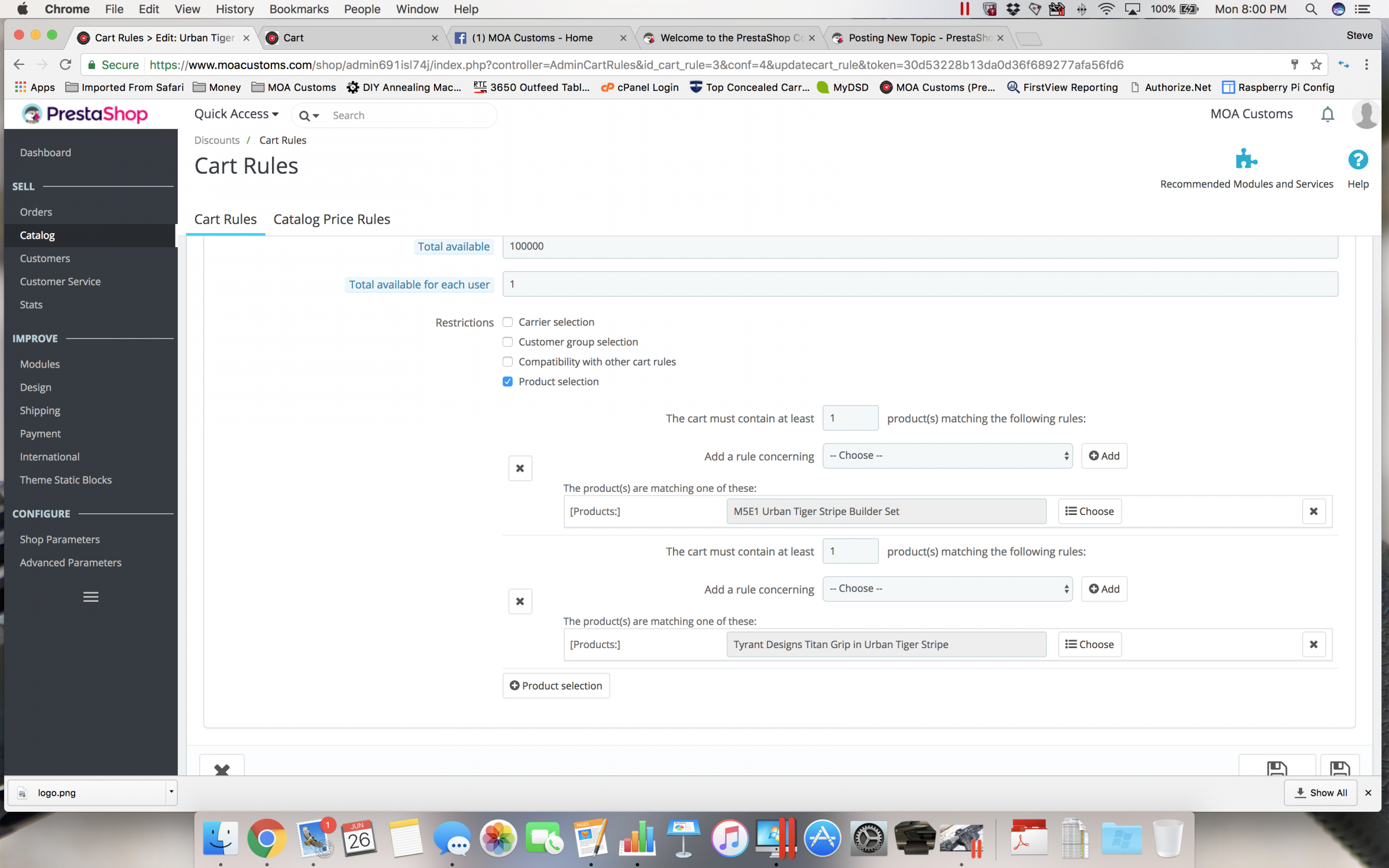 moacustoms Posted June 27, 2017 Share Posted June 27, 2017 I'm trying to create a cart rule that applies a discount when a customer adds a combination of two products to a cart. I want the discount to apply to the cart only when both products are added, but I can't figure out how to do it. I can get one product or the other, but not both. Attached is a screenshot of the cart rule, but it doesn't work. Any help would be appreciated. Link to comment Share on other sites More sharing options...