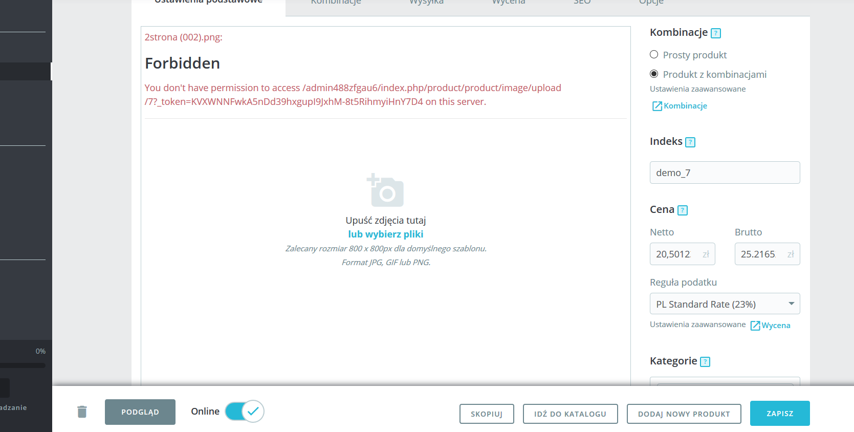 micslunet Posted July 2, 2017 Share Posted July 2, 2017 (edited) Witam, Mam zainstalowaną świeżą wersję sklepu i nie mogę dodawać zdjęć do produktów. Za każdym razem wyskakuje poniższy błąd. Czy ktoś wie jak sobie z tym poradzić? Z tego co zauważyłem to nie mogę wgrać żadnego zdjęcia przez panel admina. Przy próbie wgrania logo sklepu mam ten sam problem. Edited July 2, 2017 by micslunet (see edit history) Link to comment Share on other sites More sharing options...