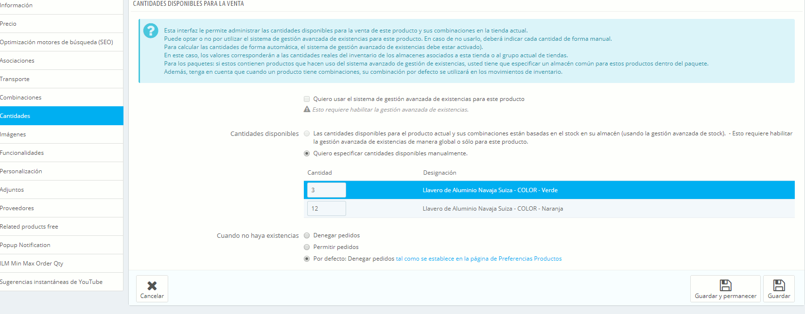 Carlos Mir Posted July 5, 2017 Share Posted July 5, 2017 Hola, tengo un problema con mi tienda. En productos donde hay creada una combinación aparece como si no estuviera stock y consecuentemente no aparece el botón de compra. El stock se ha introducido manualmente para cada combinación. Si le marco a permitir pedidos cuando no hay stock si que aparece el botón de compra. Adjunto una imagen donde se ve la cantidad para cada combinación. ¿ A alguien le ha pasado esto y lo ha podido solucionar? Un saludo Link to comment Share on other sites More sharing options...