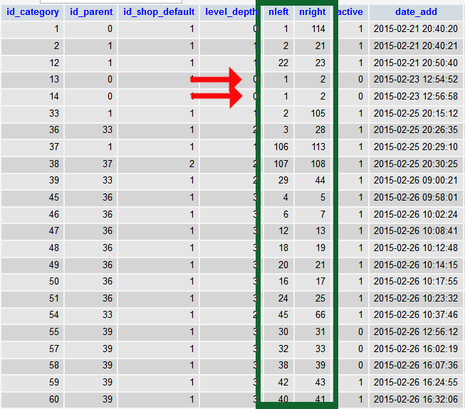 weihnachtself Posted July 5, 2017 Share Posted July 5, 2017 Hi, durchs forum habe ich schon herausbekommen, das bei kategorien die nicht angezeigt werden, man in der datenbank mal nach nleft und nright schauen muss um da ggf. statt der 0 andere werte eintragen. das habe ich getan und es läuft. zum eigtl. problem (siehe Bild): die werte sind kreuz und quer, manchen sogar doppelt vergeben (siehe pfeile, hat nix mit mir zutun)nun würde ich gern die werte fortlaufend korrigieren 1/2, 3/4 und nicht wie schon bei der ersten kategorie 1/114. kann ich das so ohne weiteres tun oder gibts da dann iwelche probleme? ich hoffe durch die "bereinigung" es endlich zu schaffen, das PS die kategorien wieder von allein anlegt so das sie auch ohne eingriff sichtbar sind und denke das dies nur nicht geht weil das arme system einfach nicht weiss welche werte es als nächstes nehmen soll, eben weil alles derart verquer ist. Link to comment Share on other sites More sharing options...