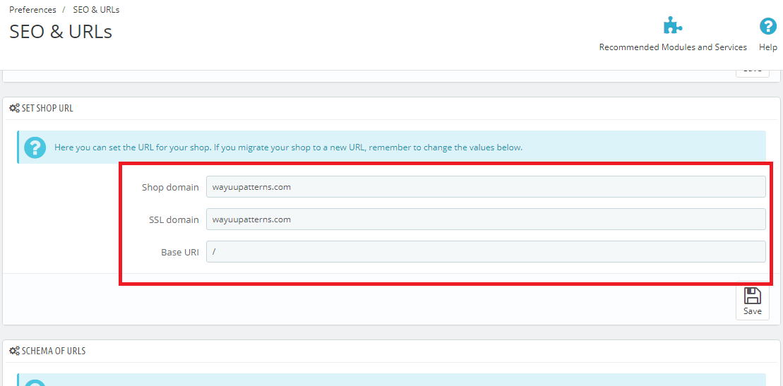 El problema es el siguiente. Modifiqué las casillas de "my shop domain" y  "SSL domain" siguiendo la notificacón en el BO informando que la Url de la tienda no concuerda con las Urls en B0>preferences>Url and Seo, lo que negativamente estaría afectando el SEO de la tienda.