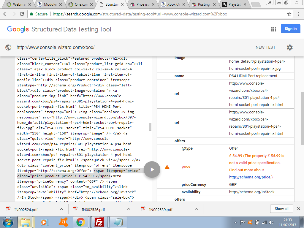 ScooterCk Posted July 11, 2017 Share Posted July 11, 2017 (edited) I am in the process of upgrading my website from PS 1.4 to PS 1.6, my live PS 1.4 site passes Googles rich snippets tests without any errors. However I am horrified to see that the home page and any category pagesm but not product pages on the new website fails on Price warnings "£ 54.99 (The property £ 54.99 is not a valid price specification. Find out more about http://schema.org/price.) ". If I run the test at a product page though it passes without any warnings ???? So if I run the test at the home page or category pages, i get the errors. https://search.google.com/structured-data/testing-tool#url=www.console-wizard.com%2Fxbox But if I run the test at any products page, i get no error (heres some examples) https://search.google.com/structured-data/testing-tool#url=http%3A%2F%2Fwww.console-wizard.com%2Fxbox%2Fxbox-one-repairs%2F265-xbox-one-laser-bluray-not-reading-games-repair.html https://search.google.com/structured-data/testing-tool#url=http%3A%2F%2Fwww.console-wizard.com%2Fxbox%2Fps4-repairs%2Fplaystation-4-ps4-hdmi-socket-port-repair-fix.html https://search.google.com/structured-data/testing-tool#url=http%3A%2F%2Fwww.console-wizard.com%2Fxbox%2Fxbox-360-slim-repair%2Freball-lead-solder-bga.html I have changed the Product.tpl file as per the below https://www.prestashop.com/forums/topic/541792-price-issue-with-rich-snippets-prestashop-1410/ This is taken from that above post The problem is in this line of code <span id="our_price_display" itemprop="price" class="price">{convertPrice price=$productPrice}</span> This will display the price including the currency symbol, for example $40.00 Google does not want the currency symbol in the price, so one thought is to remove itemprop="price" from that line <span id="our_price_display" class="price">{convertPrice price=$productPrice}</span> And instead use meta tags to provide the price and currency separately. Something like this.... <meta itemprop="price" content="{$productPrice}" /><meta itemprop="priceCurrency" content="{$currency->iso_code}" /> But this hasn't changed anything and I still get the warning?? I dont want to change to the new website to find the site is already being penalised before its even gone live? Can anybody help please ??? Thank you Scooterck Edited July 11, 2017 by ScooterCk (see edit history) Link to comment Share on other sites More sharing options...