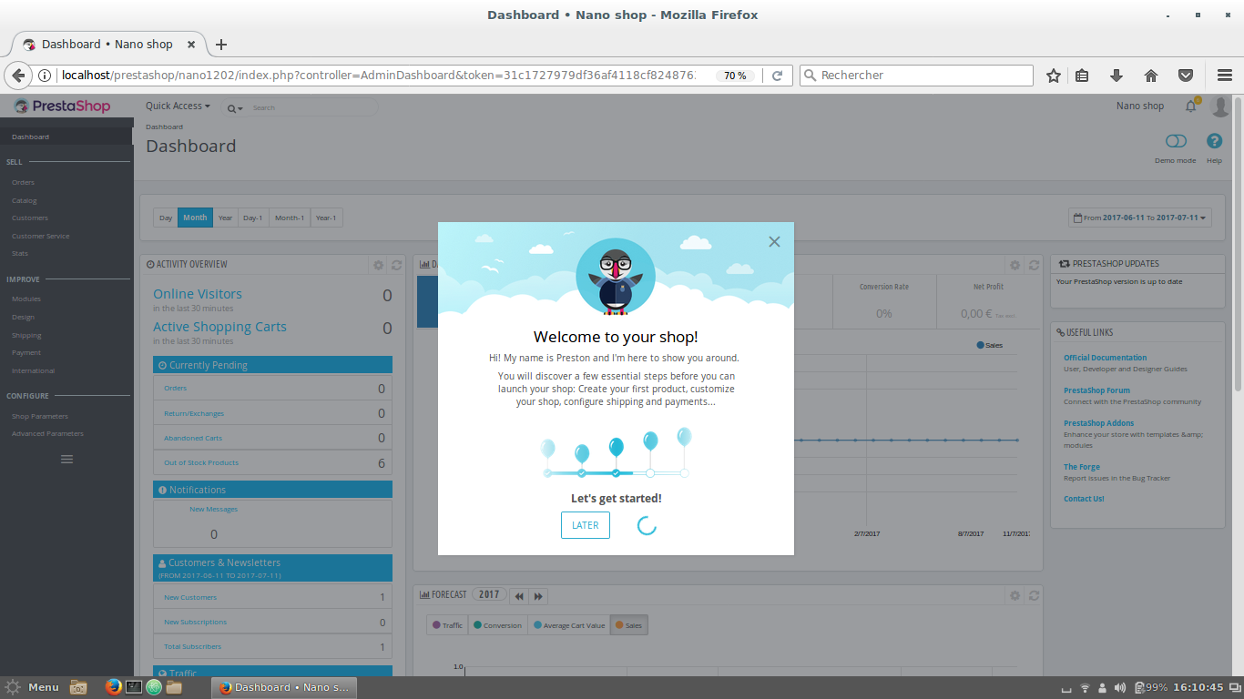 nano1202 Posted July 12, 2017 Share Posted July 12, 2017 Bonjour, Je viens d'installer prestashop, non sans mal, et j'arrive enfin à pourvoir me connecter à ma boutique, je rentre mon identifiant, mon mot de passe et quand j'arrive sur le dashboard, une petite fenetre s'ouvre pour me souhaiter la bienvenue, ce qui est plutot sympathique, sauf que cette dernière refuse de se fermer avec la croix en haut à gauche, que je ne peux pas choisir de faire le tuto plus tard et que si j'appuie sur le button start pour le tuto, ca charge dans le vide pendant des heures. Je ne sais vraiment pas quoi faire, est ce que quelqu'un pourrait avoir la gentillesse d'éclairer ma lanterne s'il vous plaît? Merci beaucoup Link to comment Share on other sites More sharing options...