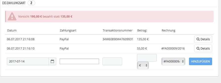 Scully Posted July 15, 2017 Share Posted July 15, 2017 Ich habe nicht alles meiner Vorredner gelesen. Aber die Fehlermeldung kommt dann, wenn der GESAMTBETRAG aller von PrestaShop erzeugten Zahlungen UNGLEICH dem Bestelltotal sind. Der Normalfall ist: Kunde bezahl. Shopbetreiber setzt den Auftrag auf Zahlung eingegangen. PrestaShop erzeugt eine (datenbankinterne) Zahlung, bei welcher der Betrag dem Auftragswert entspricht. Wenn man nun aber MANUELL eine Zahlung eingibt, kann man da z.B. auf eine Bestellung von 100 EUR auch nur eine Zahlung von EUR 75 manuell eingeben. Genau dann kommt obige Fehlermeldung. Oder ich ändere Beträge, gebe Ermässigungen NACHDEM die Zahlung eingegangen ist. Was man auf jeden Fall sicher sagen kann - das ist kein Bug von PrestaShop sondern falsches Handling. Wenn Du Zugriff auf die Datenbank hast, können wir das genau analysieren. Link to comment Share on other sites More sharing options...