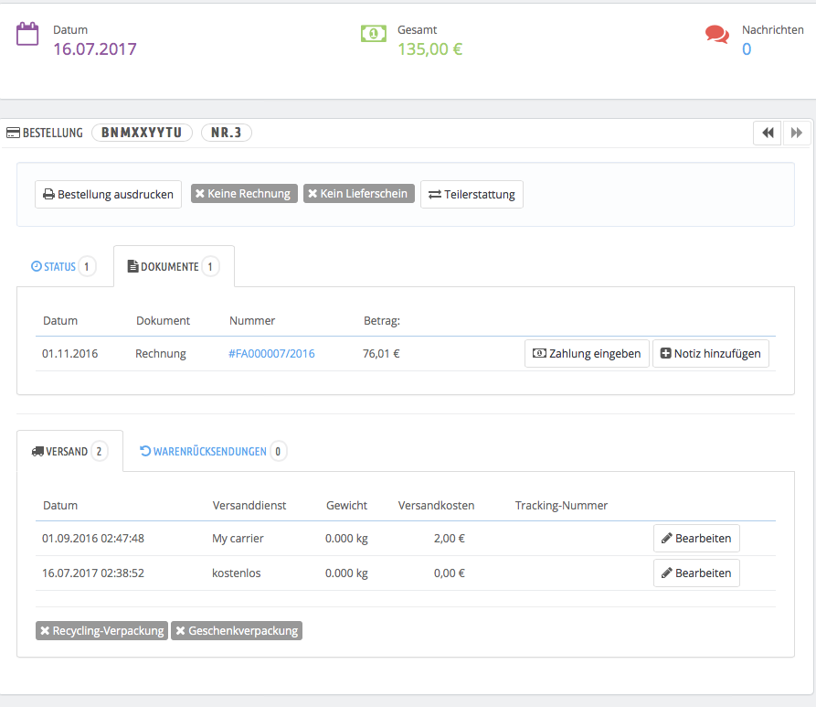 gb030 Posted July 16, 2017 Author Share Posted July 16, 2017 Ich habe gar nichts manuell gemacht. Habe gerade eine Testbestellung gemacht. 135,-EUR Bekomme per Mail richtige Zahlungsaufforderung. Bei Dokumente im Backend steht nun (ohne das ich irgendwas gemacht habe !!!!) 76,01 Das Datum der Rechnung ist auch falsch. (ist bei allen Bestellungen komischerweise das Gleiche Datum) Mich wundert auch wieso der Versanddienst "My carrier" zusätzlich immer noch auftaucht, obwohl ich ihn schon lange gelöscht habe. (siehe Screenshot Versanddienste) Auch das zugehörige Datum ist merkwürdig. (Auch bei allen Bestellungen das Gleiche) Richtig ist nur der kostenlose Versand. Hier stimmt auch das Datum. Das sind mir jetzt zu viele unlogische Dinge. Ich denke eine saubere Neuinstallation ist nicht vermeidbar und führt am schnellsten zum Ziel. Bei dieser Installation habe ich auch viel getestet und ausprobiert, wer weiß was da alles hängengeblieben ist. Da es ein sehr kleiner Shop ist, habe ich mal bei Word Press geschaut und werde das auch mal ausprobieren. Finde das Prestashop nicht wirklich benutzerfreundlich ist. (Kommt mir so vor wie von Programmierern für Programmierern) Aber Danke für die Hilfe-Unterstützung. Link to comment Share on other sites More sharing options...