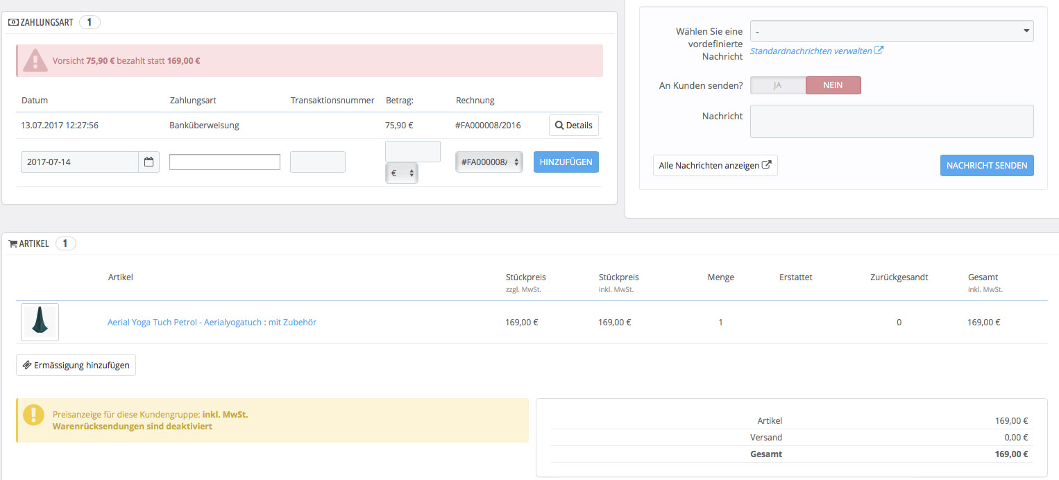gb030 Posted July 14, 2017 Share Posted July 14, 2017 Ich habe ein Problem mit der Zahlungsart. (Prestashop 1.6.1.6) Es kommt bei Banküberweisung die Fehlermeldung Vorsicht 75,90 bezahlt statt 169,00 Dadurch wird auch eine falsche Rechnung erzeugt. Wie wird diese "Vorsicht" - Meldung erzeugt? Das Programm kann ja nicht wissen wieviel irgendwer auf ein Bankkonto überweist. Das hat ja nun auch nichts mehr mit Rundungsfehlern zu tun. Wie kommt Prestashop auf 75,90? (Es wurden natürlich die 169,- überwiesen), die Rechnung wird aber auf diese merkwürdige Zahl 75,90 ausgestellt. Bei Paypal kommt auch irgendein Schwachsinn. Dort wurde angeblich zu viel überwiesen.135 und 55. Das ergibt sich weil angeblich 2 Paypal Transaktionen stattfanden. Die zweite mit 55,- fand aber nie statt? Sie hat auch keine Transaktionsnummer. Das Problem die Rechnung bezieht sich natürlich wieder auf die falsche nicht vorhandene Transaktion mit 55,- Die eigentlich stattgefundene Paypalüberweisung mit 135,-, welche auch eingegangen ist, kommt in der Rechnung gar nicht vor. Link to comment Share on other sites More sharing options...