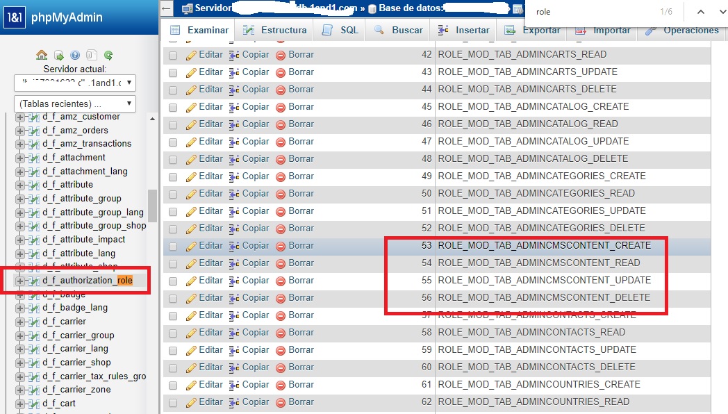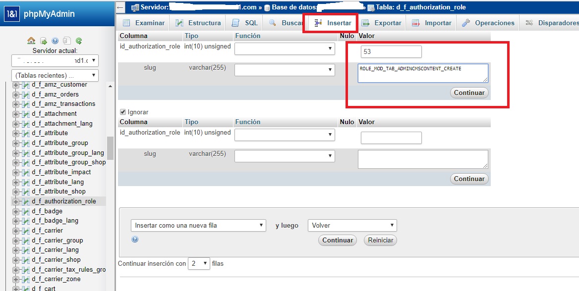 Ricardo Posted July 18, 2018 Share Posted July 18, 2018 Hola, tengo la solución al problema "Acceso Denegado" en Diseño>Páginas Antes que nada generen respaldo de la base de datos. Deben ingresar a su PhpMyAdmin de su base de datos. Posteriormente seleccionan la tabla "d_f_authorization_role" (donde d_f es el prefijo de su base de datos, puede ser p_s o cualquiera que hayan puesto) Luego, verifiquen que tengan las lineas de las tablas 53, 54, 55, 56 como se muestra en la imagen role_mod.jpg Si no tienen las tablas que es lo más seguro, deben crearlas dando clic en "Insertar" en las pestañas de la parte superior, como se muestra en la imagen role_mod_2.jpg adjuntada. Así deben crear las cuatro lineas: 53 ROLE_MOD_TAB_ADMINCMSCONTENT_CREATE 54 ROLE_MOD_TAB_ADMINCMSCONTENT_READ 55 ROLE_MOD_TAB_ADMINCMSCONTENT_UPDATE 56 ROLE_MOD_TAB_ADMINCMSCONTENT_DELETE Posteriormente ingresan a su B.O, Diseño>Páginas y listo. Link to comment Share on other sites More sharing options...