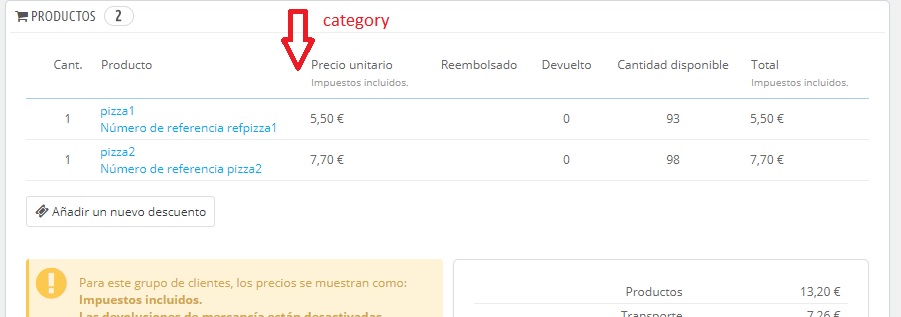 moraira Posted July 19, 2017 Share Posted July 19, 2017 (edited) Hola Aguiu, chupao ya has localizado el fichero que tienes que modificar (uno de ellos) en \AdminXXXXXXXX\themes\default\template\controllers\orders\_product_line.tpl debes poner la categoria donde desees, si es antes de importe seria en la linea 48, dentro de la tabla de productos (tr) y justo despues de la columna (td) de la imagen y nombre del producto <tr class="product-line-row"> <td>{if isset($product.image) && $product.image->id}{$product.image_tag}{/if}</td> <td> <a href="{$link->getAdminLink('AdminProducts')|escape:'html':'UTF-8'}&id_product={$product['product_id']|intval}&updateproduct&token={getAdminToken tab='AdminProducts'}"> <span class="productName">{$product['product_name']}</span><br /> {if $product.product_reference}{l s='Reference number:'} {$product.product_reference}<br />{/if} {if $product.product_supplier_reference}{l s='Supplier reference:'} {$product.product_supplier_reference}{/if} </a> <div class="row-editing-warning" style="display:none;"> <div class="alert alert-warning"> <strong>{l s='Editing this product line will remove the reduction and base price.'}</strong> </div> </div> </td> AQUI {if ($order->getTaxCalculationMethod() != $smarty.const.PS_TAX_EXC)} creamos otra columna con la categoria... es un poco más largo de lo normal porque debemos averiguar el nombre a partir de su ID, y ademas indicarle en qué idioma. Creamos la comumna (TD) con el nombre de la categoria por defecto, la primera linea podría ser un simple <td> pero te lo pongo con formato por si lo quieres resaltar (<td align="center" style="color:green; font-weight:normal; font-size:14px ">) <!-- agregamos la categoria por defecto --> <td align="center" style="color:green; font-weight:normal; font-size:14px "> <span>{Category::getLinkRewrite((int)$product['id_category_default'], (int)$id_lang)}</span> </td> veras que queda un poco descolocado, es porque ahora debemos ir a la cabecera y agregar también una columna con la palabra Categoría ahora vamos al fichero \AdminXXXXXXXX\themes\default\template\controllers\orders\helpers\view\view.tpl, aqui agregamos una columna justo después del nombre, es decir despues de: <th><span class="title_box ">{l s='Product'}</span></th> agregamos la nuestra <th style="text-align: center; color:green"><span class="title_box ">{l s='Category'}</span></th> Una vez más le damos formato para destacarlo.... si lo queremos igual que el resto el th lo ponemos sin style, simplemente <th>... como texto podríamos poner solo ...box">Categoría</span... pero lo serio es ponerlo en ingles y luego en traducciones ponerle lo que queramos ...{l s='Category'}... y ahí lo tienes Edited July 19, 2017 by moraira (see edit history) 1 Link to comment Share on other sites More sharing options...