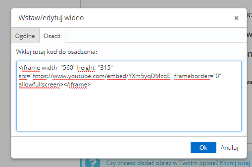 Niestety wygenerowany kod z youtube, po wstawieniu przez standardową opcję "wstaw wideo"->"osadź"->wklejenie kodu iframe, wyświetla jedynie szarą ramkę ze znakiem zapytania.