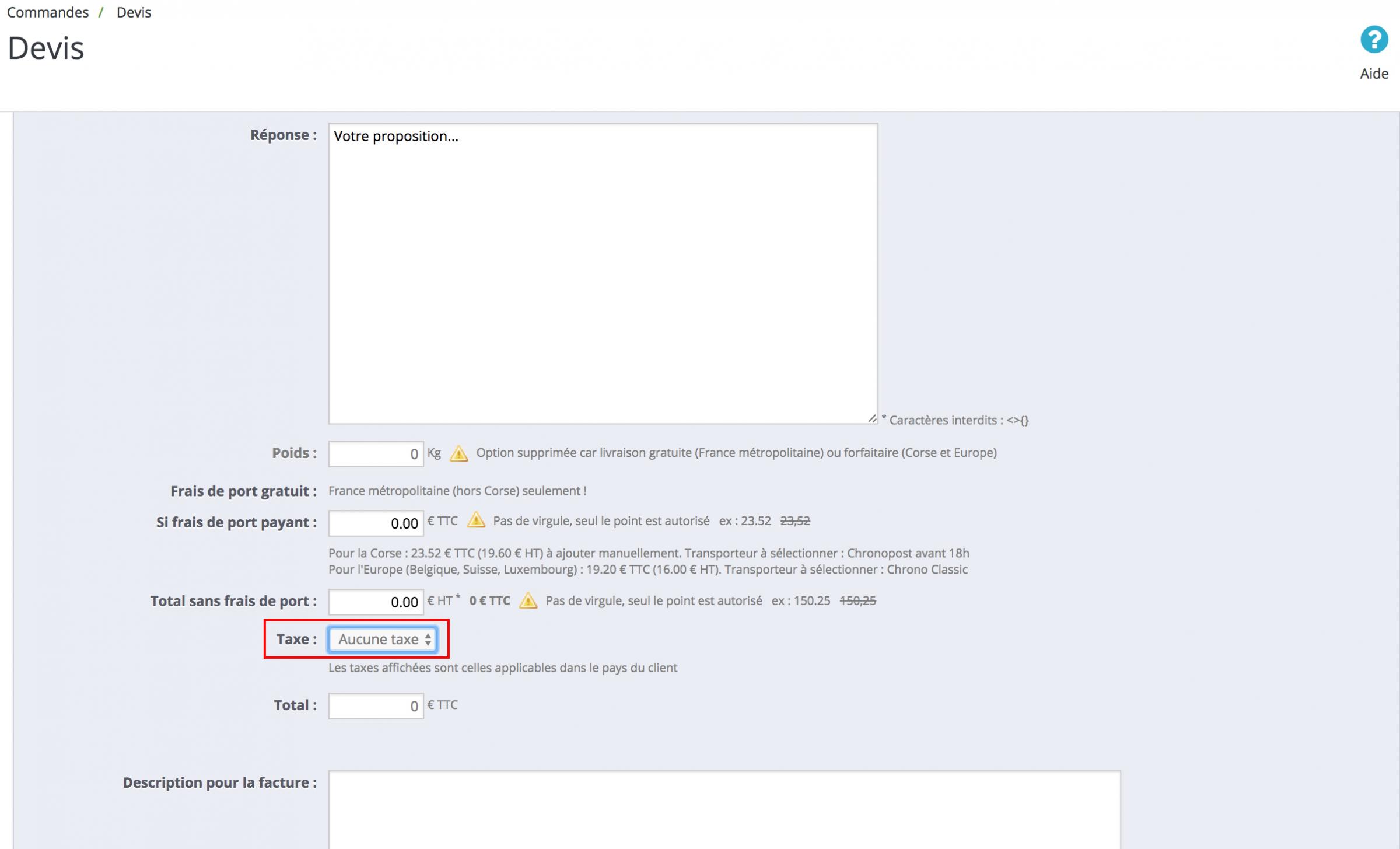 Au sein du Back Office, dans Commandes -> Devis, je peux taper ma réponse, rentrer des frais de port, mais au niveau de la Taxe, il est coché "aucune taxe" et je ne peux pas sélectionner d'autres options. J'ai pourtant bien rempli les taxes pour chaque pays etc...