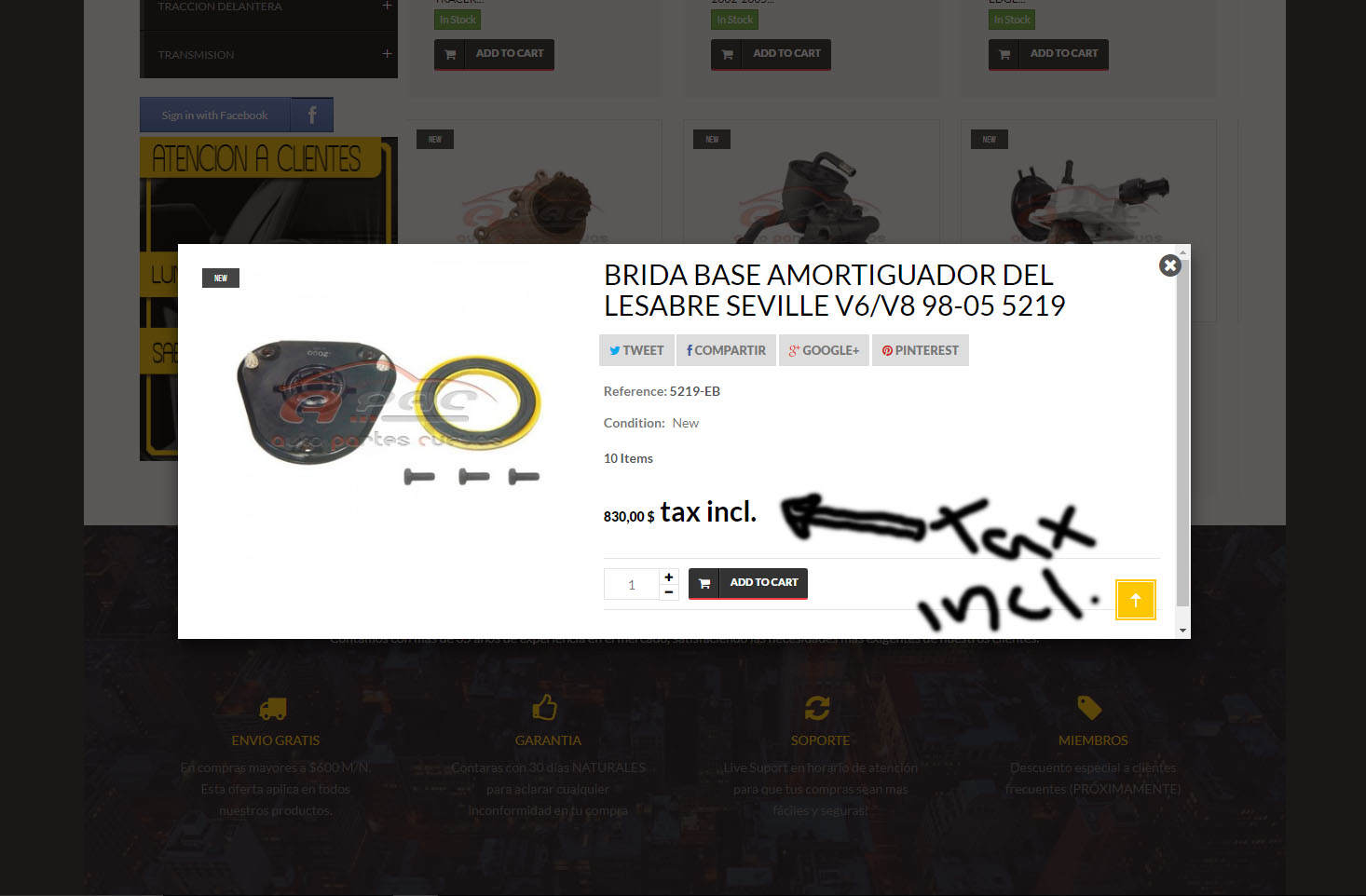 interporter Posted July 24, 2017 Share Posted July 24, 2017 Hola colegas, buen dia tengan ustedes, veran... quisiera modificar esta parte (Tax inc.) de mi pagina, cuando doy clic en ''Vista rapida'' (Quick View) en algun producto sale a un lado del precio la leyenda ''Tax Incl.'' me gustaria que esta leyenda desapareciera o en su defecto saliera como ''Iva Incl.'' ya probe modificando el ''Cart.tpl'' y no me da resultado, anexo fotos del ''error'' Saludos a todos, espero me puedan ayudar y yo poder ayudarles algun dia. Link to comment Share on other sites More sharing options...