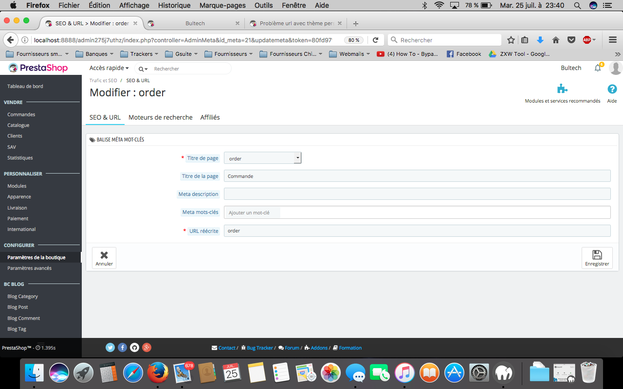 Bultech Posted July 26, 2017 Author Share Posted July 26, 2017 En fait, quand je modifie dans parametres / trafic et SEO, la page par defaut "order" son url réecrite est "commande". Si je modifie cette url réecrite et que je met order, la le theme perso pointe bien vers la bonne url, jusque la c'est normal. Je me dis par contre si je remet le theme classic la ca ne devrait plus fonctionner, et bien non ca fonctionne toujours, il appel toujours la bonne url que ce soit /order ou /commande. Par contre le theme perso lui n'est pas capable d'en faire autant, il appel constamment /order. Par contre je ne suis pas certain de trouver les bons tpl order, si vous savez m'aiguiller Atch ... Link to comment Share on other sites More sharing options...