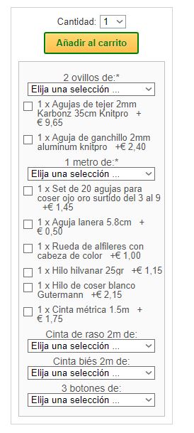 demax81 Posted July 26, 2017 Share Posted July 26, 2017 Hola. Estoy desarrollando una tienda en Prestashop 1.7 y queria hacer algo como lo que aparece en esta web: http://costurea.es/faldon-y-gorro-de-bebe-tarrasa Es decir un producto configurable donde el usuario pueda incluir en el pack los productos que quiere. Tras darle unas vueltas he pensado hacerlo por combinaciones, pero hay productos en los que me salen miles de combinaciones posibles y al intentar hacerlas en la administración de producto me sale un error 500. ¿Se le ocurre a alguien como puedo hacerlo? Muchas gracias. Un saludo. Link to comment Share on other sites More sharing options...