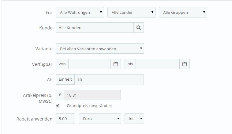 Lindwedler Posted July 28, 2017 Author Share Posted July 28, 2017 Ist bei allen Artikeln (neuen und extra angelegten) der gleiche Effekt. Auch der Preis, der rabatt, die Menge oder die Verwendung mehrerer Preisregeln ändert nix. Werden zusätzlich andere Preisregeln verwendet, rechnet er zwar völlig korrekt, schreibt aber auch hier immer Fix den Rabatt als Preis. SO als wenn da ne völlig falsche Variable ausgegeben würde. Strange ... Werde mal das Rechnungsmodul deaktivieren und schauen ob sich dann was ändert. ist das einzige Modul was nicht zum Standard gehört. Ansonsten: Es läuft php 7, und sonst auch nix was ungewöhnlich wäre. Link to comment Share on other sites More sharing options...