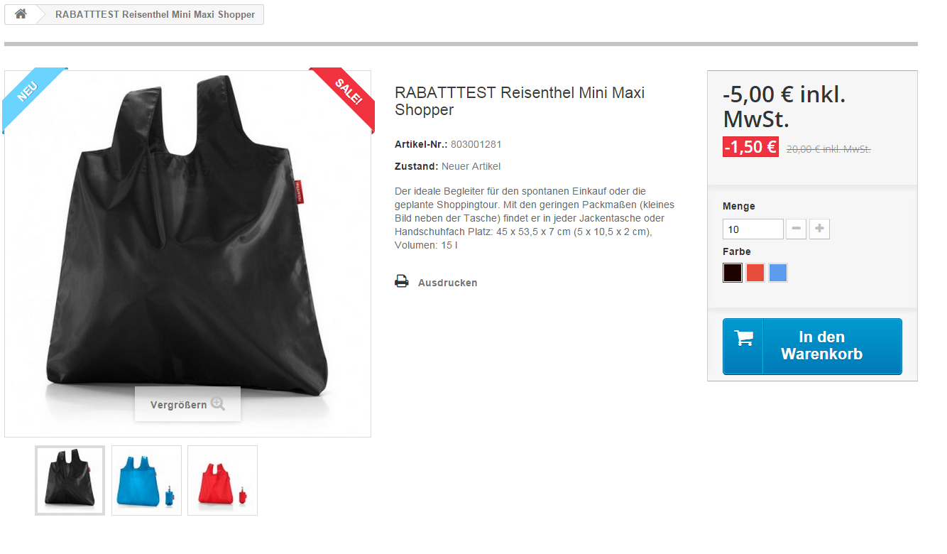 Lindwedler Posted July 27, 2017 Share Posted July 27, 2017 Wir haben ein Problem bei der Nutzung der Sonderpreis-Funktion bei Angaben einer Mindestmenge. Im Beispiel haben wir einen Rabatt von 5 Euro ab einer Bestellmenge von 10 als Sonderpreis definiert (Bild 1). Im Frontend angezeigt (Bild 2) wird jedoch dann -5 Euro als Preis, wobei dann im Warenkorb jedoch der richtige Preis berechnet wird (Bild 3). Ist das ein Fehler in unserer Release oder ein Denkfehler bei der Rabatteingabe? Wir benutzen Prestashop 1.6.1.15. Ulli Link to comment Share on other sites More sharing options...