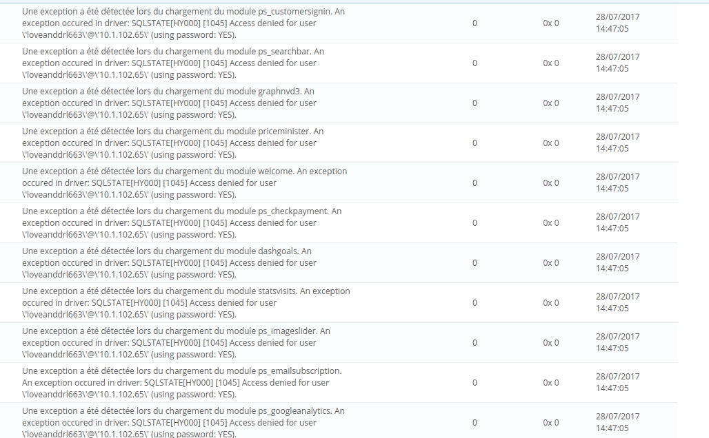 Love-And-Dream Posted July 28, 2017 Share Posted July 28, 2017 Mon site ne fonctionne plus,N'arrivant pas à mettre à jour mon prestashop avec le module 1 click upgrade, j'ai multiplié les manipulations,J'ai modifié le mot de passe de ma base de données OVH,Et j'ai obtenu une fatal error sur tous mes sites (plus d'accès par prestashop à ma base)J'ai appelé OVH, qui m'a fait modifier le mot de passe sur mon fichier "parameters.php". La fatal error n'est plus là, mais j'ai plein d'erreurs en back office: plus d'accès à mes produits, il me dit que je n'ai aucun module, etc etc En mode debug j'ai ce type de message d'erreur:at Driver->connect(array('driver' => 'pdo_mysql', 'host' => 'mysql684.sql001', 'port' => '3306', 'dbname' => 'loveanddrl663', 'user' => 'loveanddrl663', 'password' => 'XXXXXXXXXXXX', 'charset' => 'UTF8', 'driverOptions' => array(), 'serverVersion' => '5.1'), 'loveanddrl663', 'XXXXXXXXXXXX', array()) in Connection.php line 360 XXXXXXXXXX étant mon ancien mot de passe de base de donnée, alors que j'ai renseigné le nouveau dans le fichier parameters.php Alors, pour résoudre le problème, j'ai bien pensé à remettre cet ancien mot de passe par défaut, mais il est nécessaire de mettre au moins un chiffre, et le mot de passe par défaut n'en contenait pas! Au secours, je deviens fou, je ne sais plus quoi faire Link to comment Share on other sites More sharing options...