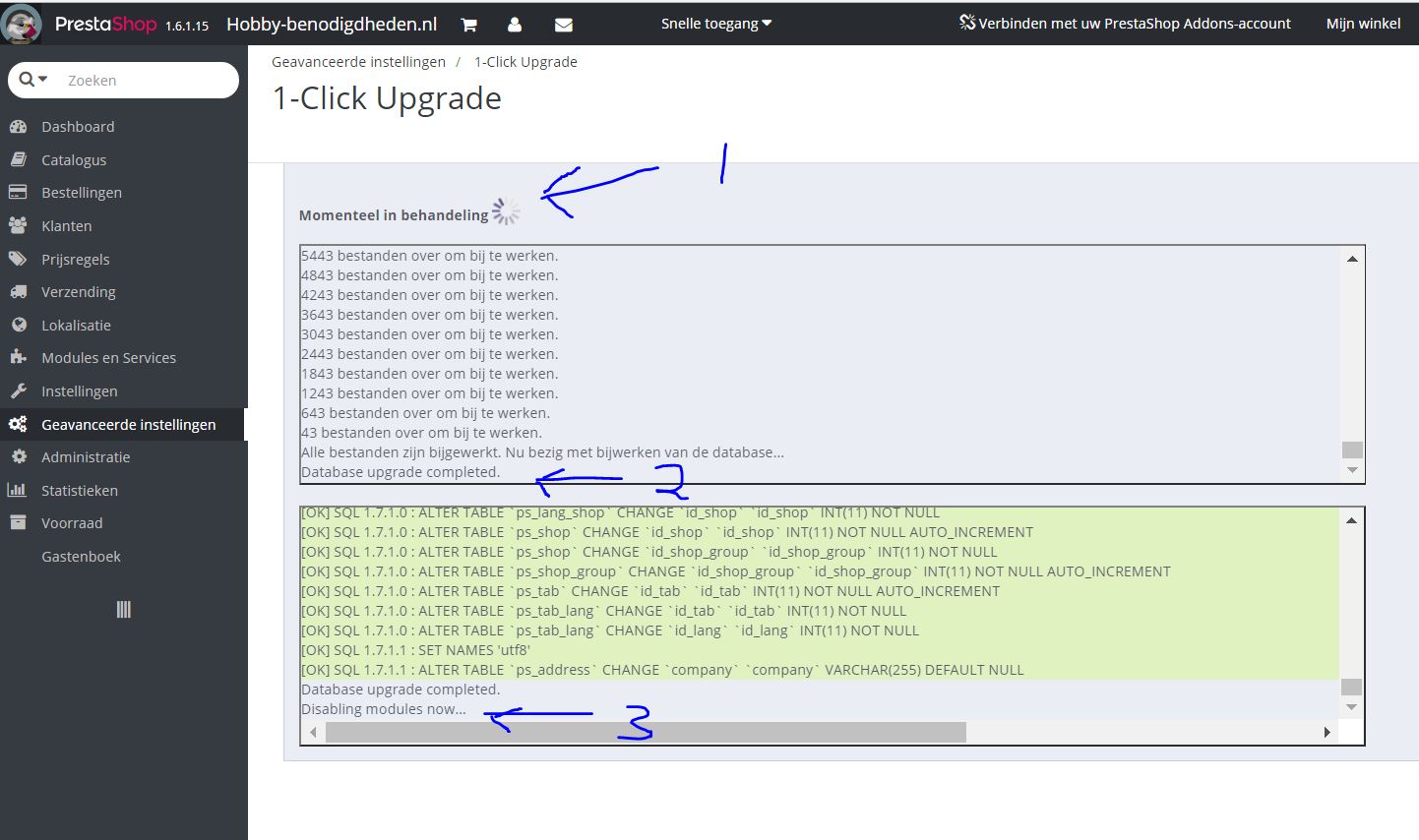 racemaniac Posted July 31, 2017 Author Share Posted July 31, 2017 bedankt iedereen voor het meedenken. Even nog voor de duidelijkheid, de upgrade van de database en het bijwerken van de files gaat allemaal goed. Database upgraded completed Disabling modules now Upgrade blijft hangen bij het disablen / uitschakelen van de modules Qua server en PHP instellingen lijkt alles dus gewoon goed te staan Het is dus een "hang-up" op het uitschakelen (en bijwerken) van de modules Link to comment Share on other sites More sharing options...