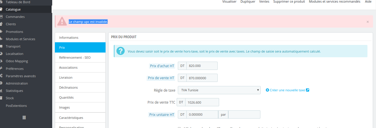 The update is done but when I want to change the price manually the following error is displayed: The upc field is invalid.