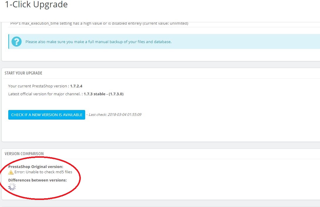 rogy30 Posted March 4, 2018 Share Posted March 4, 2018 (edited) Heloo! I have a problem with update from 1.7.2.4 to 1.7.3.0 Error: Unable to check md5 files and on Differences between versions:: dont show nothing HEEELLLPPPP Edited March 4, 2018 by rogy30 (see edit history) Link to comment Share on other sites More sharing options...