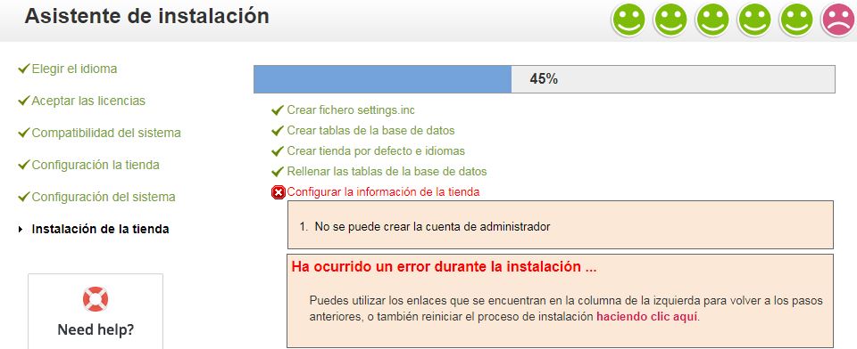 prestamas Posted August 7, 2017 Share Posted August 7, 2017 (edited) me inicio en prestashop 1.6, realice todos los pasos previos para la instalacion pero se detiene en este paso y me muestra el siguiente mensaje : Configurar la información de la tienda No se puede crear la cuenta de administrador Ha ocurrido un error durante la instalación ... se queda en 45% de la instalacion, esto me tiene entrampado no se como solucionarlo, su ayuda porf. Edited August 7, 2017 by prestamas (see edit history) Link to comment Share on other sites More sharing options...