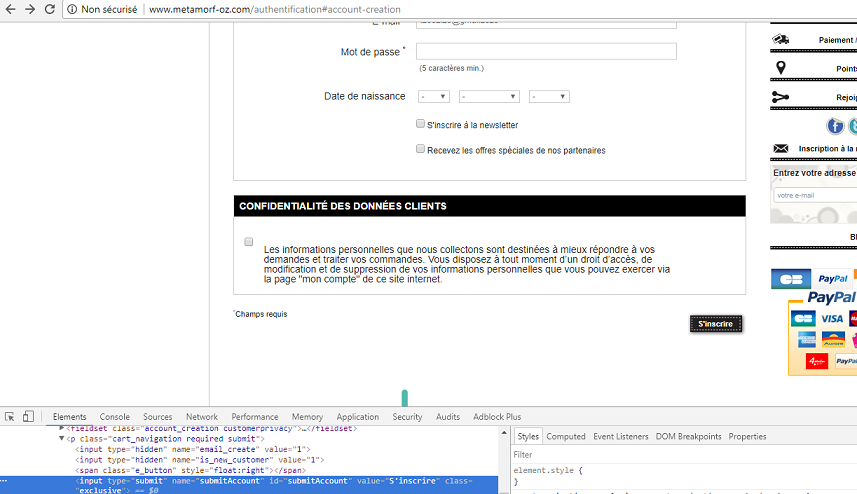 trinkyz Posted August 7, 2017 Share Posted August 7, 2017 Bonjour à tous, je viens vous demander votre aide concernant un problème que je rencontre sur mon site (Prestashop 1.5.2.0), je ne sais pas vraiment pourquoi mais le bouton "s'inscrire" ne fonctionne plus et quand on clique on a droit à une erreur 500, quelqu'un a-t-il rencontré le même problème ? J'ai joint une photo du code du bouton au cas où, je n'obtiens pas de message d'erreur en debug mode.Merci d'avance pour votre aide, Cordialement Link to comment Share on other sites More sharing options...