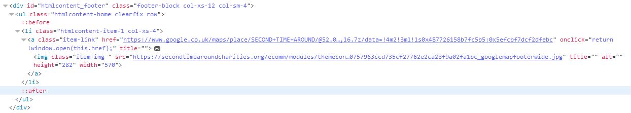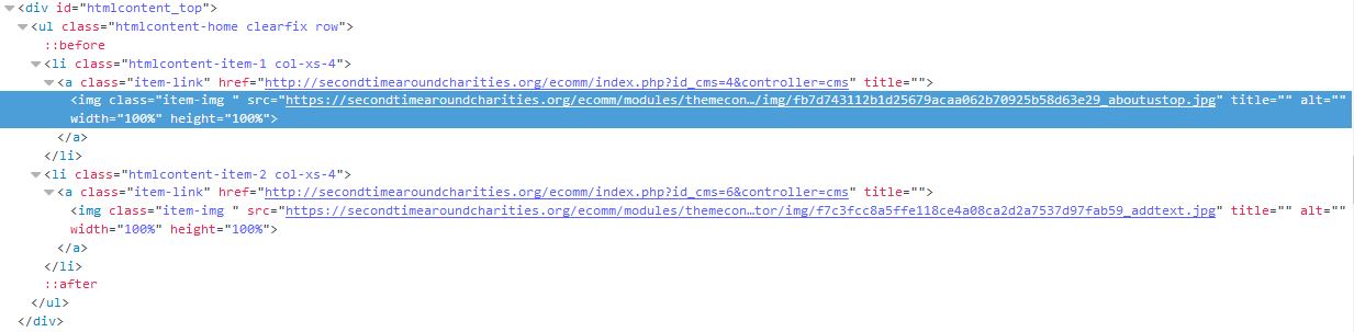 BrainSuperGlue Posted August 12, 2017 Author Share Posted August 12, 2017 I think img-responsive isn't intended to handle such large images there. It's difficult to say without having a link to your shop. Hi Scully, So I was thinking on this, the responsive side pictures on the site are of similar sizes to the non responsive map in the footer. All of these pictures are controlled by the ThemeConfigurator. I've attached the code for those side pictures and it doesn't look to have the img-responsive tag there but does state "100%" width and height which would still work given the smaller dimensions of the mobile window. The link to the site BTW is this : https://secondtimearoundcharities.org/ecomm/index.php Link to comment Share on other sites More sharing options...