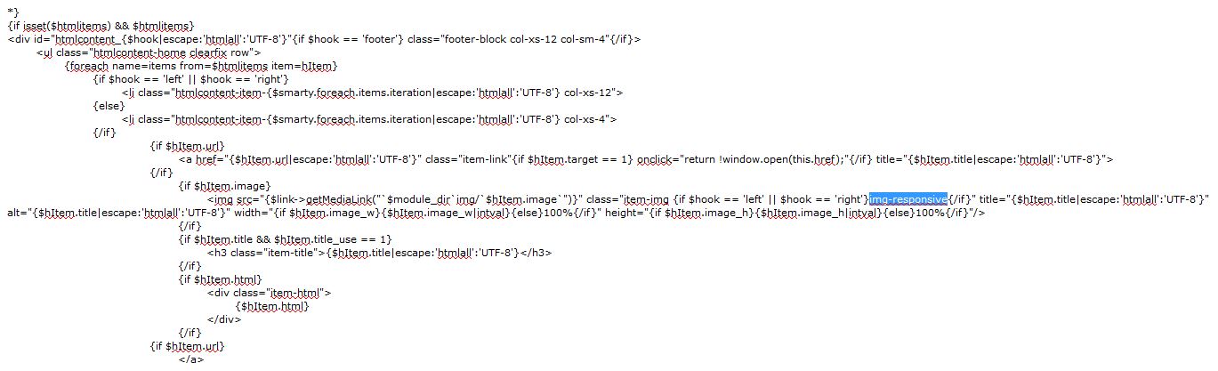 BrainSuperGlue Posted August 11, 2017 Author Share Posted August 11, 2017 In this case your file is located at the modules path: modules/themeconfigurator/views/templates/hook The filename is hook.tpl. Hi, OK, so I went to the hook.tpl file at that location and it already has img-responsive in it. Any ideas? BSG Link to comment Share on other sites More sharing options...