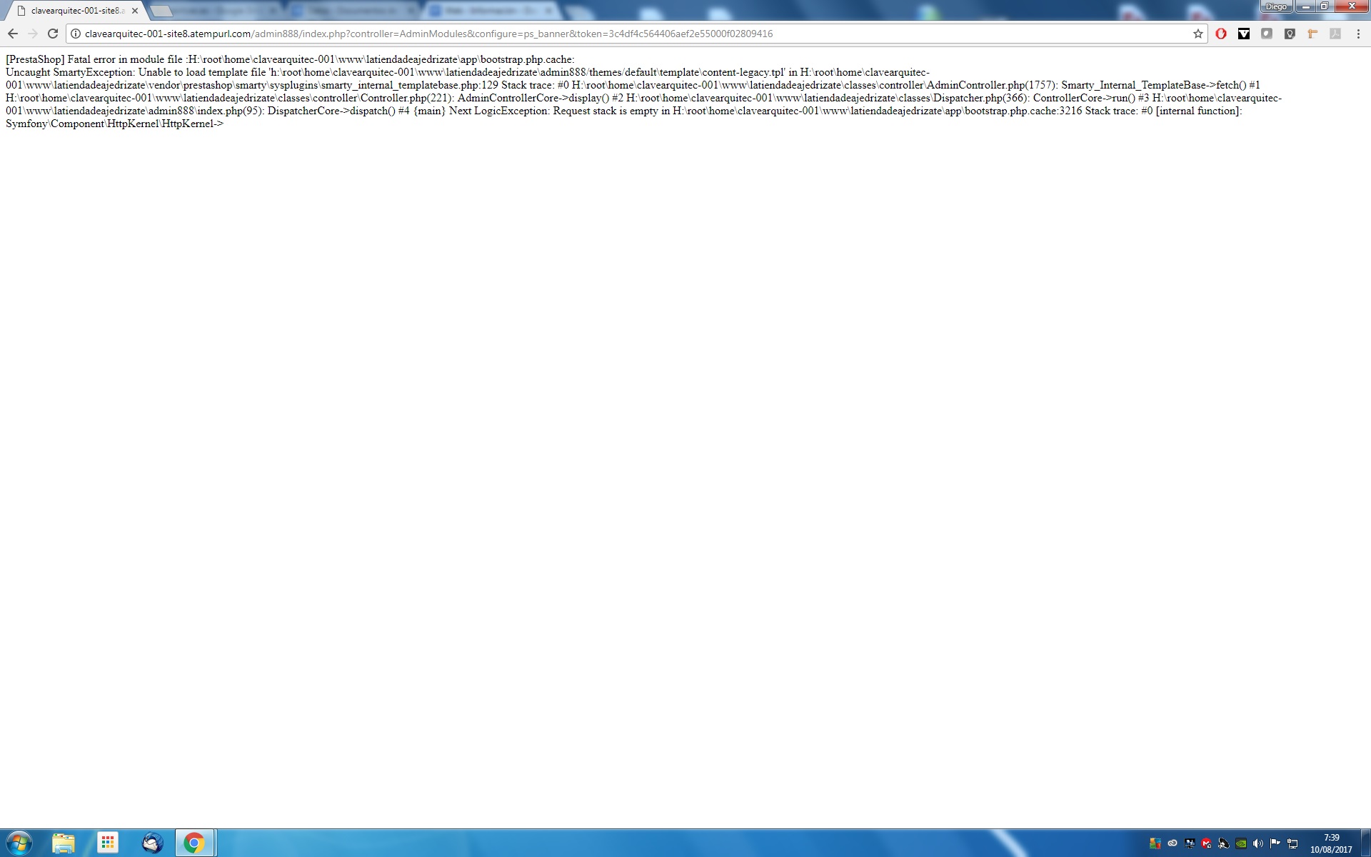 diego.campillo@gmail Posted August 10, 2017 Share Posted August 10, 2017 (edited) Hola, estoy usando la versión 1.7.0.4, y utilizo la plantilla estándar. La URL de la tienda es, aunque mi duda es del backoffice. http://clavearquitec-001-site8.atempurl.com He creado un usuario con perfil SalesMan. Le he dado permisos para gestionar los módulos. Inicio sesión con mi usuario de perfil SalesMan, y accedo a Módulos Instalados, y busco Banner o Carrusel, para que pueda editar las fotografías, y entonces me da el error que adjunto al intentar dar a Configurar. [PrestaShop] Fatal error in module file :H:\root\home\clavearquitec-001\www\latiendadeajedrizate\app\bootstrap.php.cache:Uncaught SmartyException: Unable to load template file 'h:\root\home\clavearquitec-001\www\latiendadeajedrizate\admin888/themes/default\template\content-legacy.tpl' in H:\root\home\clavearquitec-001\www\latiendadeajedrizate\vendor\prestashop\smarty\sysplugins\smarty_internal_templatebase.php:129 Stack trace: #0 H:\root\home\clavearquitec-001\www\latiendadeajedrizate\classes\controller\AdminController.php(1757): Smarty_Internal_TemplateBase->fetch() #1 H:\root\home\clavearquitec-001\www\latiendadeajedrizate\classes\controller\Controller.php(221): AdminControllerCore->display() #2 H:\root\home\clavearquitec-001\www\latiendadeajedrizate\classes\Dispatcher.php(366): ControllerCore->run() #3 H:\root\home\clavearquitec-001\www\latiendadeajedrizate\admin888\index.php(95): DispatcherCore->dispatch() #4 {main} Next LogicException: Request stack is empty in H:\root\home\clavearquitec-001\www\latiendadeajedrizate\app\bootstrap.php.cache:3216 Stack trace: #0 [internal function]: Symfony\Component\HttpKernel\HttpKernel-> ¿Cómo puedo solucionarlo? Gracias. Edited August 10, 2017 by diego.campillo@gmail (see edit history) Link to comment Share on other sites More sharing options...