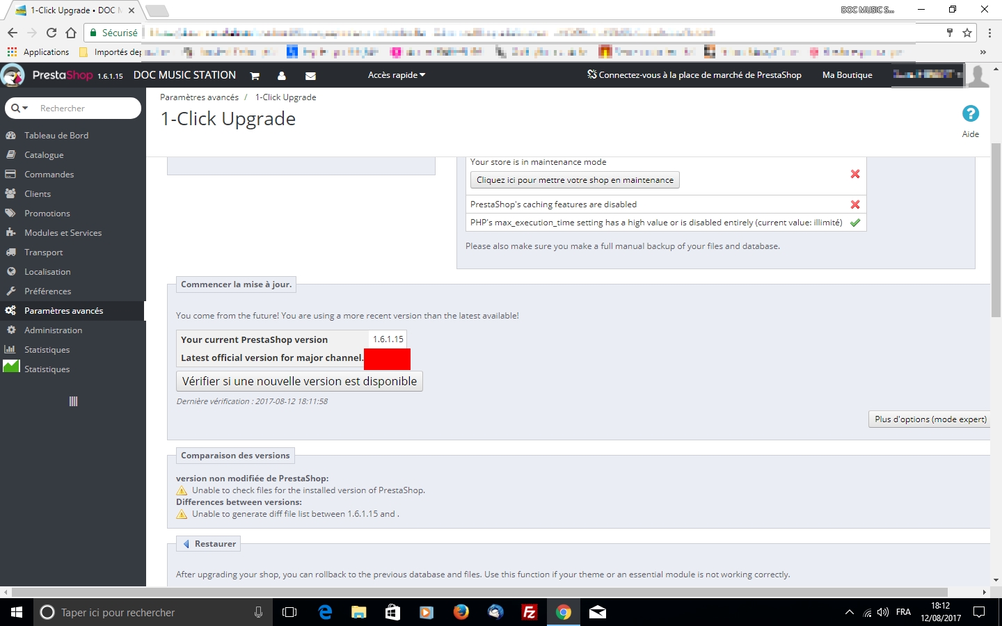 docmusicstation Posted August 10, 2017 Share Posted August 10, 2017 (edited) Bonjour J'ai fait backup de mon site en local et testé la mise a jour en 1.6.1.16 pas de soucis tout fonctionne bien Or quand je veux mettre a jour le site en production dans le module 1 click upgrade j'ai ce message : Vous venez du futur ! Vous utilisez une version plus récente que la dernière disponible ! Je precise pour avoir lu un sujet qui ressemble que je n'ai pas le module disableupgrademodule d'installé. le fichier settings .inc indique bien 1.6.1.15 et la table ps_configuration indique bien aussi 1.6.1.15 Alors que je suis en 1.6.1.15 et bien entendu il ne me trouve pas la version 1.6.1.16 ... Edited August 11, 2017 by docmusicstation (see edit history) Link to comment Share on other sites More sharing options...