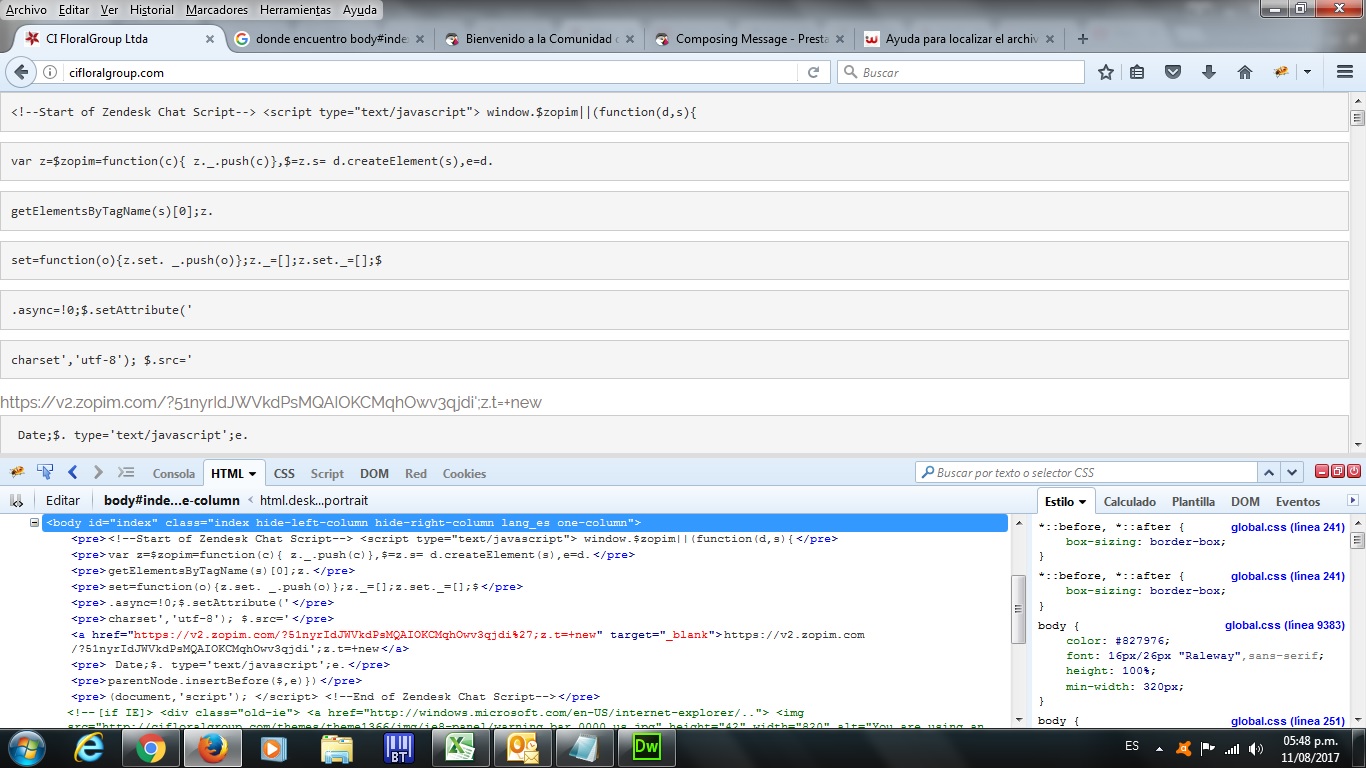 josefero80 Posted August 11, 2017 Share Posted August 11, 2017 Hello, my name is jose ojeda, and first I want to thank for your help. I was trying to install the zopin chat by using the htmlbox module, and unfortunately, it wrote the lines on the html body section on my prestashop. And now every time I open my web page, it first shows the html line that I included on the htmlbox module. I am trying to delete these lines, I was searching on the firebug extension, I found the lines that I want to delete, but I can't find the route neither the archive where is placed the html that I want to edit. Where is the html archive? Thank you so much for your help. here is the screen shot. Link to comment Share on other sites More sharing options...