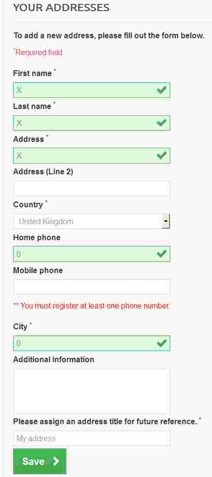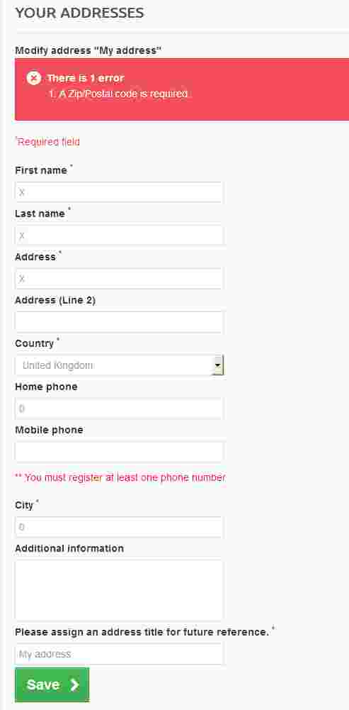 veganline Posted August 13, 2017 Share Posted August 13, 2017 My prestashop 1.6 shows- an error message " Zip/postal code not found "- a shopping cart address form, with no box for the Zip/postal code- a backoffice > localisation > countries > UK file with the post code enabledScreenshots are below and on https://postimg.org/gallery/39c0zbhx2/ . Configuration stuff is belowI have looked on other threads and tried disabling all caches, and changing from a single-page shopping cart form to a multi-page one.It may be relevant that the UK has no single postcode format such as so-many numbers or so-many letters, so the default settings leave the formatting option blank. Does anybody know a work-around?Thanks in advanceJohnOh apprently I can post images here - I'll do that as well----------------------------------------------------------------------------------------------------------------------- CONFIGURATION INFORMATION This information must be provided when you report an issue on our bug tracker or forum. SERVER INFORMATION Server information Linux #1 SMP Thu Mar 9 05:49:24 EST 2017 x86_64 Server software version Apache PHP version 5.6.31 Memory limit 128M Max execution time 30 DATABASE INFORMATION MySQL version 10.0.32-MariaDB MySQL server localhost MySQL name MySQL user Tables prefix ps_ MySQL engine InnoDB MySQL driver DbPDO STORE INFORMATION PrestaShop version 1.6.1.13 Shop URL http://veganline.com/x/ Current theme in use default-bootstrap MAIL CONFIGURATION Mail method You are using the PHP mail() function. YOUR INFORMATION Your web browser Mozilla/5.0 (Windows NT 5.1) AppleWebKit/537.36 (KHTML, like Gecko) Chrome/49.0.2623.112 Safari/537.36 CHECK YOUR CONFIGURATION Required parameters OK Optional parameters OK LIST OF CHANGED FILES Changed/missing files have been detected. updated files (1) controllers/front/AuthController.php Link to comment Share on other sites More sharing options...