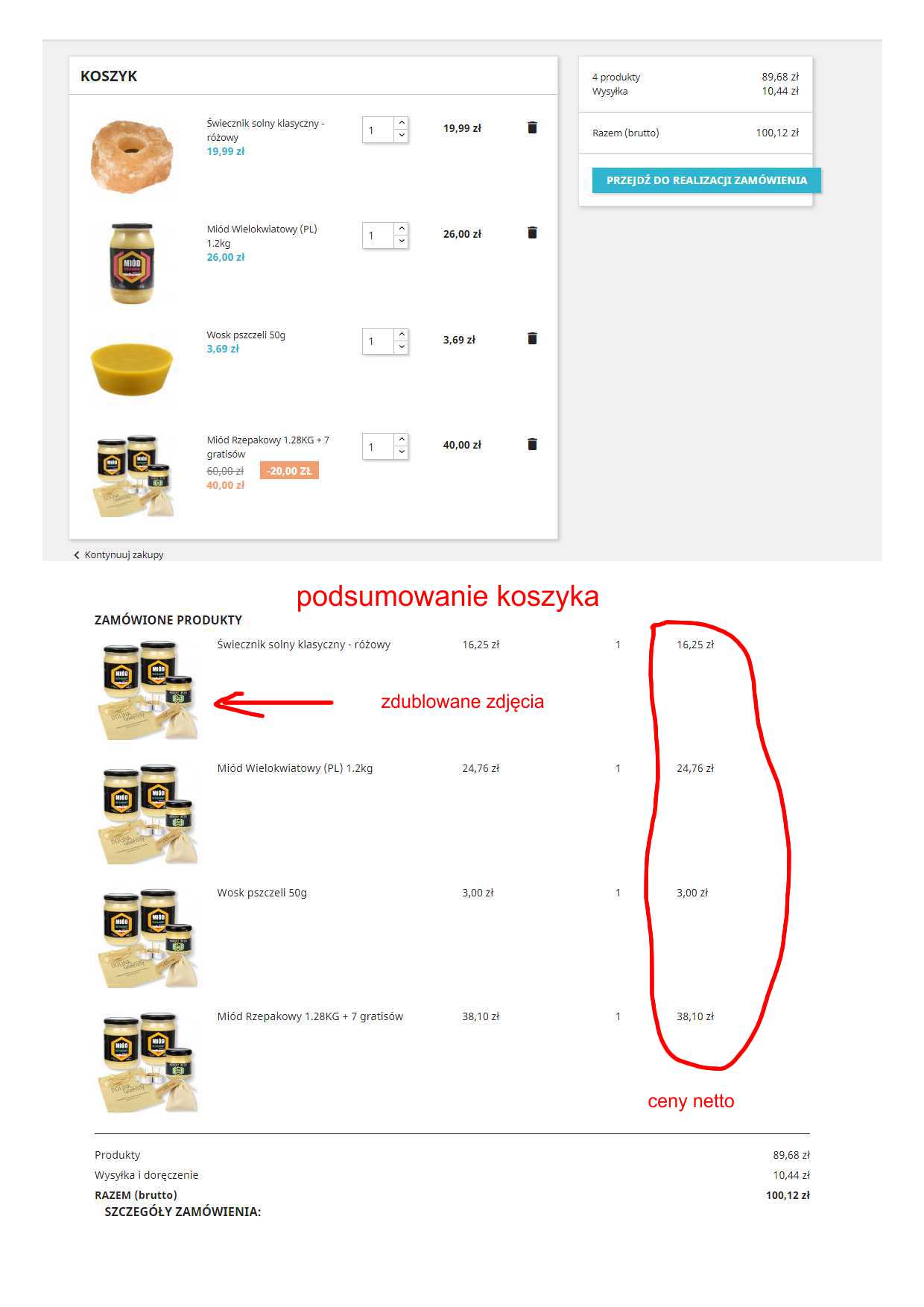 bblues Posted August 17, 2017 Share Posted August 17, 2017 Witajcie. Presta 1.7.2.0. Szablon klasyczny. Zakup - Koszyk - Potwierdzenie - Płatność - OK Ale po zatwierdzeniu płatności w podsumowaniu zamówienia 2 problemy: 1 - ceny wyświetlają się netto. 2 - miniatury - wygląda na to, że Presta wybiera losowo obrazek i dodaje jednakowy do każdej pozycji. Zerknijcie na zrzut ekranu. Z góry dziękuję za pomoc. Link to comment Share on other sites More sharing options...