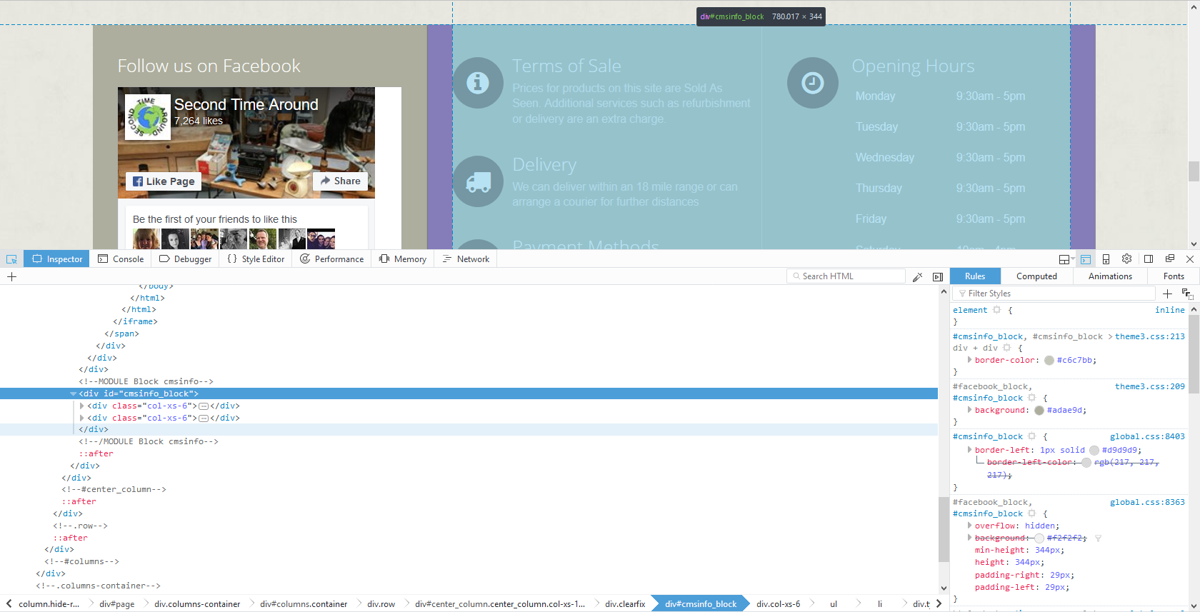 BrainSuperGlue Posted August 23, 2017 Share Posted August 23, 2017 Hi,Prestashop 1.6.1.0, default bootstrap theme.Having an odd issue. When the screen is full width on desktop, the Facebook social block and the cmsinfo block appears fine. When the screen is shrunk, gradually the opening times disappear off the bottom the block until the cmsinfo block disappears completely.Looking at the Inspect, it doesn't appear to be a hidden-xs etc issue. Just odd.Any ideas?Many thanksBSG Link to comment Share on other sites More sharing options...